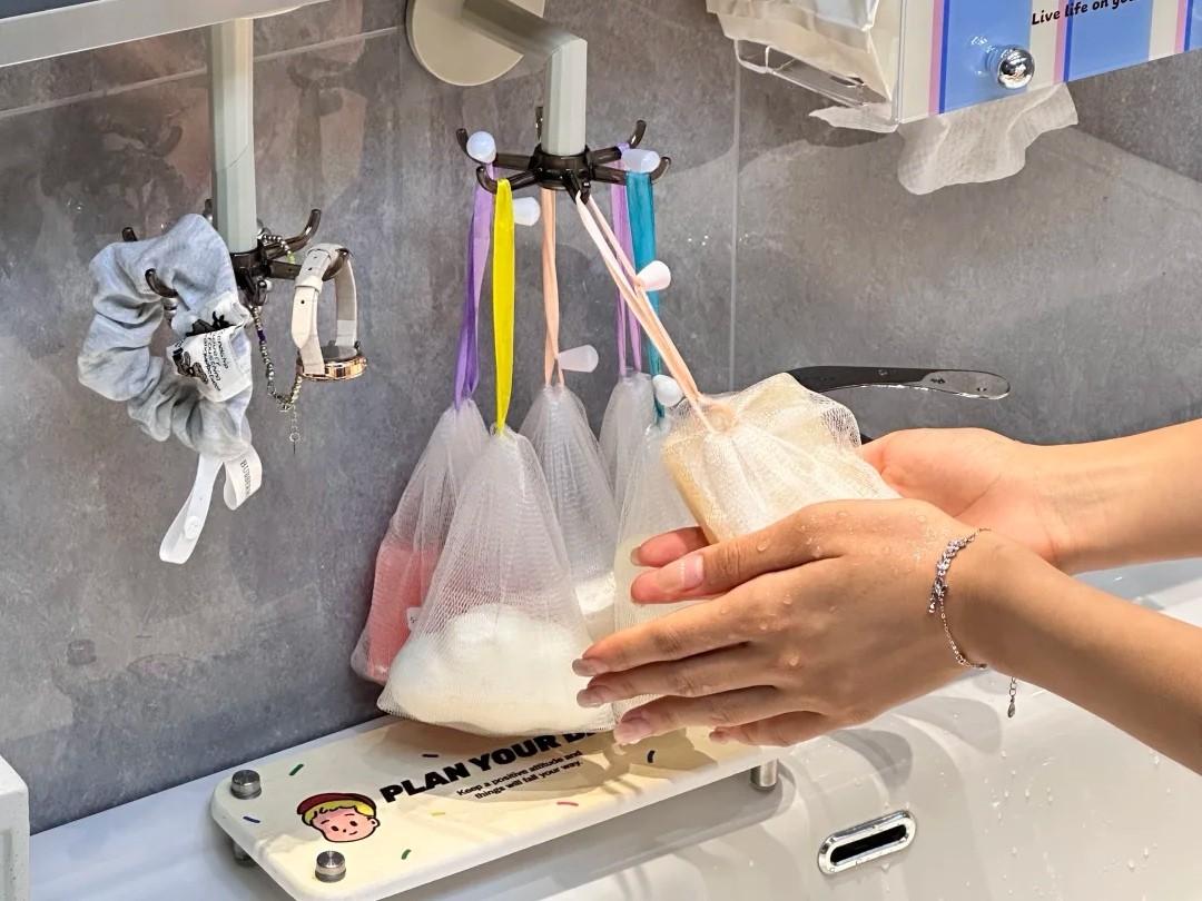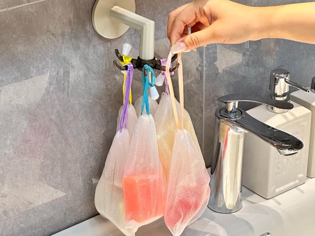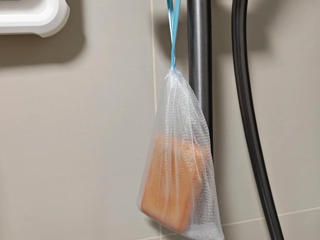而這回裝修以後,老公不知道從哪學的,把香皂裝在兜裏,掛起來。兜就是簡單的網兜,我看着就像是用口罩裁剪的。
