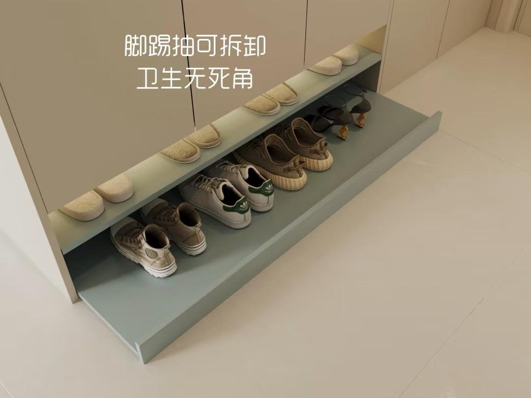 每次回到家,用腳踢一下踢腳抽,抽屜就彈出來了。把鞋放進去,然後用腳輕輕一推,再也不用彎腰找鞋了。關鍵是,裏面衛生死角要被擋住了。