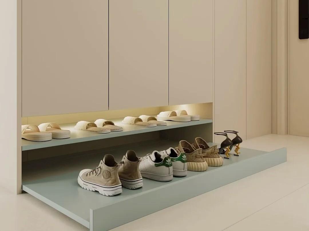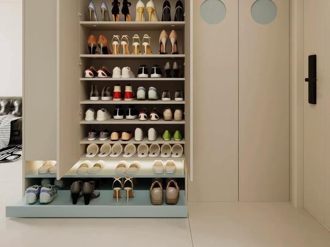 入戶鞋櫃常規的設計方案是鞋櫃到底,還有就是鞋櫃下面空一格或者是空兩格。當然,現在到底的鞋櫃基本上被淘汰了。
