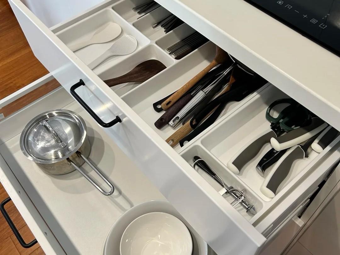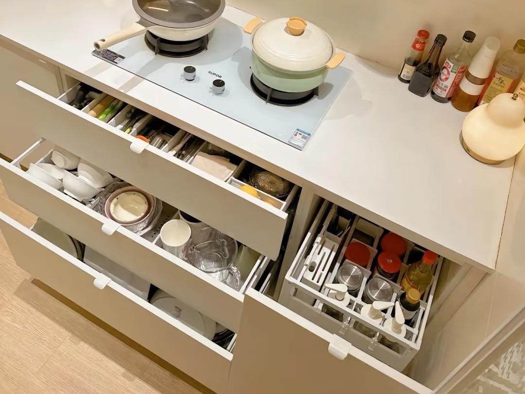 廚房裝修,確實應該考慮收納。將櫃子多改幾個抽屜,你會發現收納能力翻倍,而且實用性更強了。唯一的缺陷就是要多花錢。