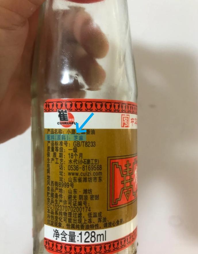 同樣是廚房調味品,崔字牌小磨香油和蓮花味精有一拼,原料都只有一種。連添加劑的影子都找不到~