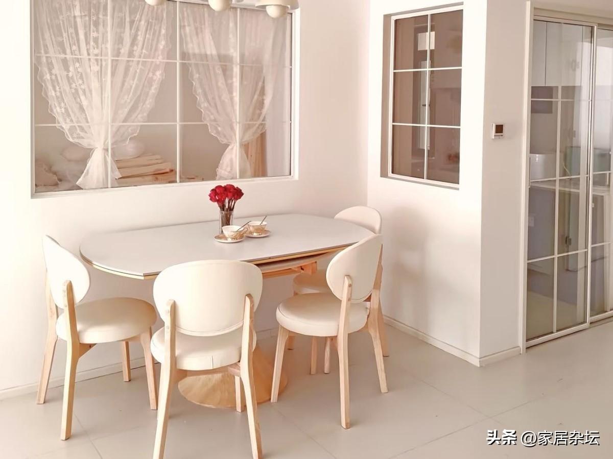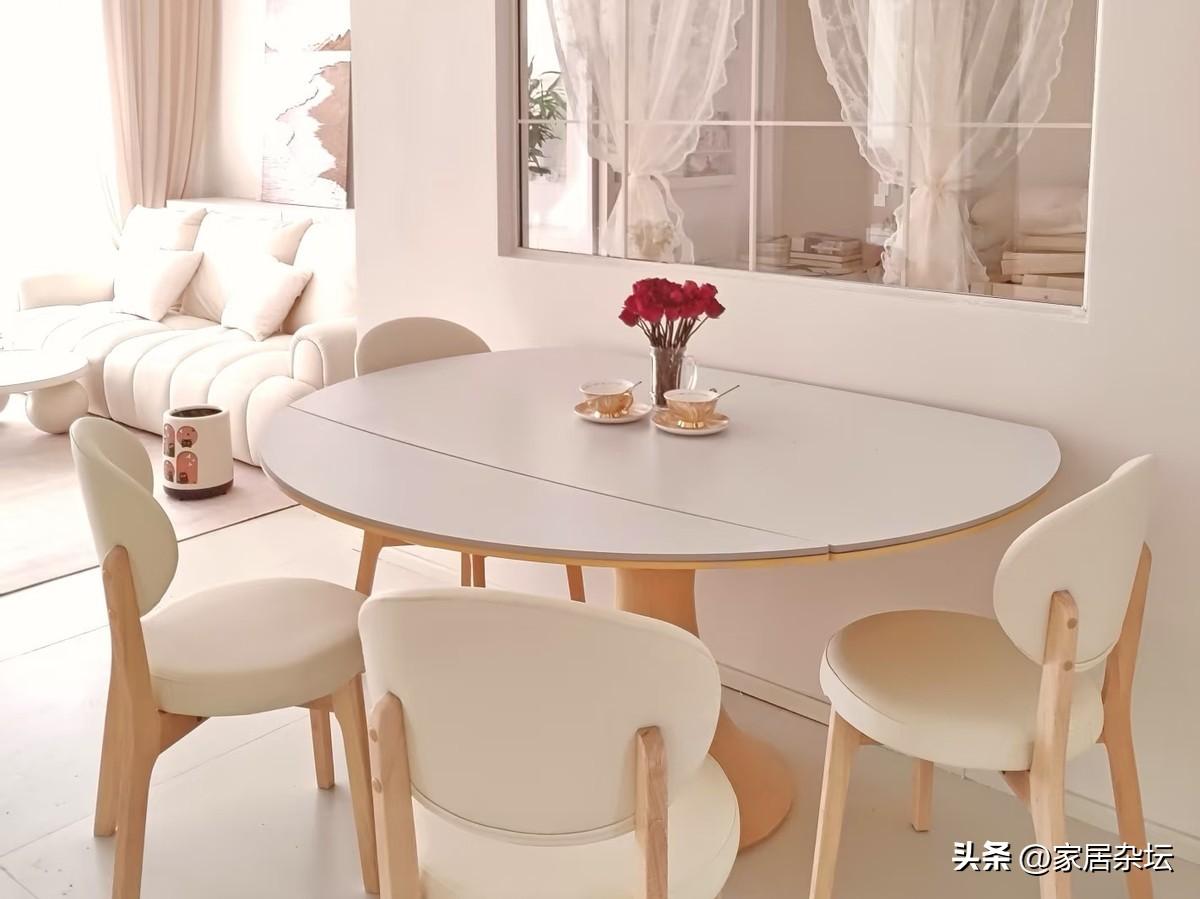 對於大多數普通家來說,建議大家考慮方形或者是長型餐桌。特別是小戶型,可考慮伸縮款,更靈活。其實也可以考慮小圓桌。我們要根據日常人口和空間大小選擇合適的尺寸,平時能夠靠牆放,人多的時候把它拉出來,這類餐桌更實用。