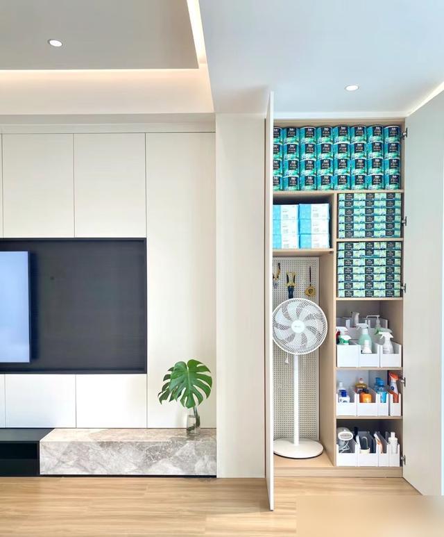 把收納刻進骨子裏,滿牆櫃子藏起雜物,開放格擺點小擺件,家裏立馬顯大不雜亂。