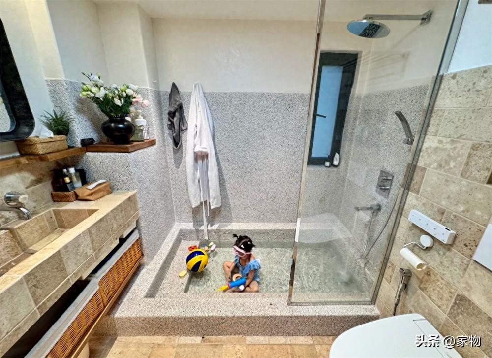 重慶夫妻(@JIOJIO)曬出了他們給孩子打造的衛生間浴池,兩人將原本淋浴區的擋水石抬高,搭配臺階做出了一個下沉式的磚砌浴池,讓孩子夏天可以在裏面玩水。