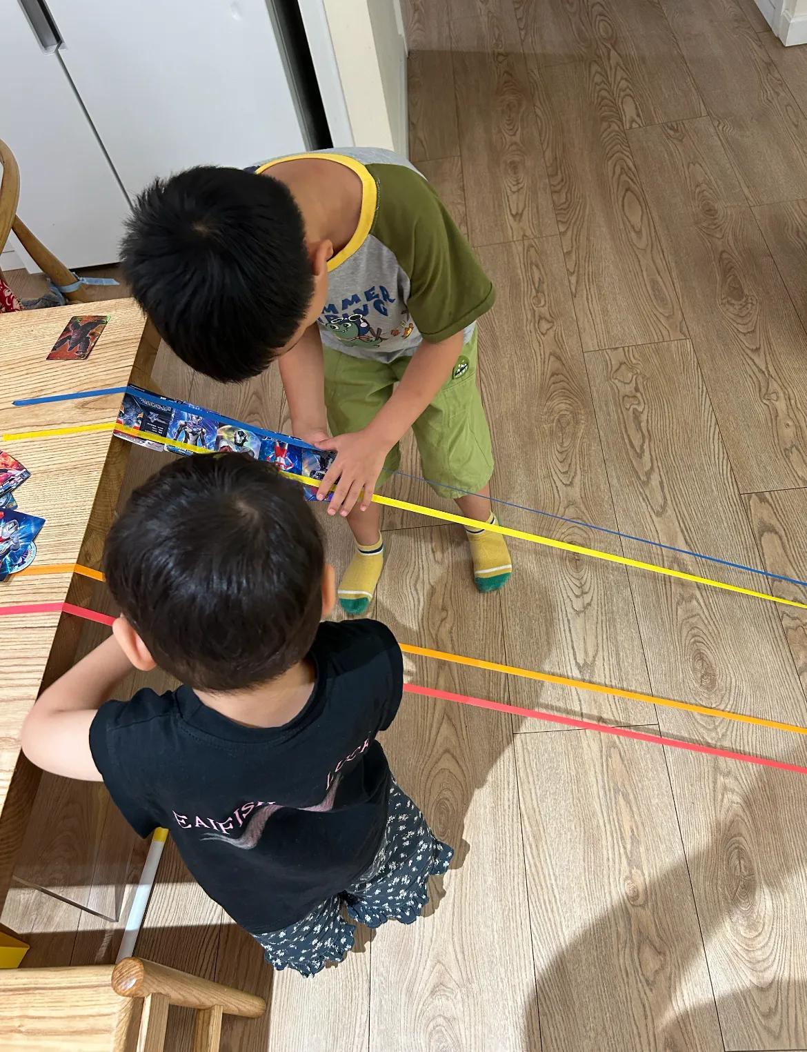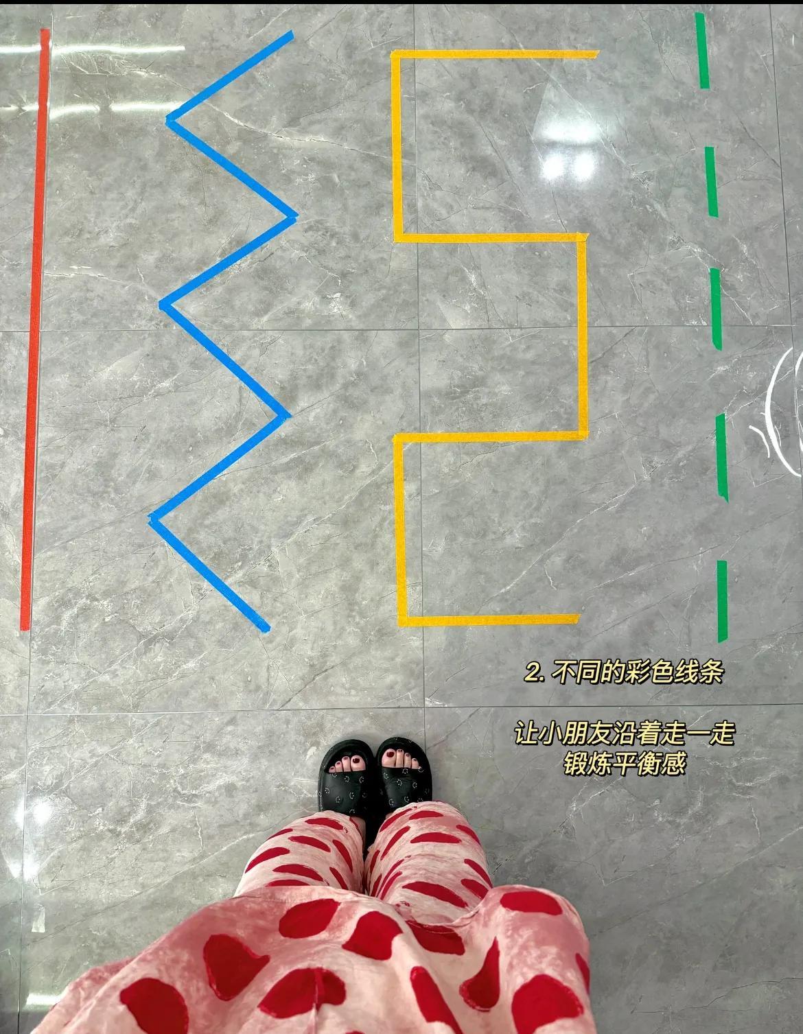 還可以貼成不同形狀的線條,讓娃沿着線走、單腳跳,既能鍛鍊身體的平衡感,又對專注力培養有好處。
