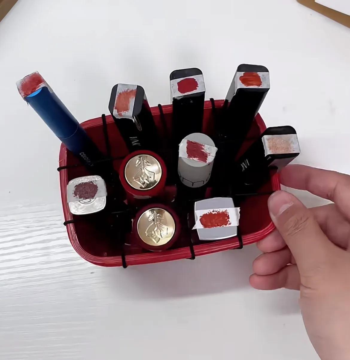 女生口紅太多,很容易忘記哪個是什麼色?這時,撕點美紋紙,塗上口紅貼在瓶身上,不用打開也知道顏色,直觀又方便。