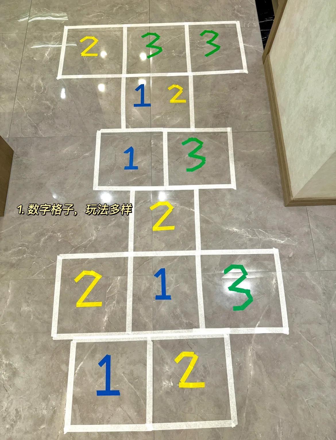 用它在地面貼成數字格子,孩子蹦蹦跳跳中達到了運動的目的,還可以做加法,比如我說跳4,小朋友可以跳2+2或者1+3,邊玩邊學,效果比讓它掰指頭好多了。