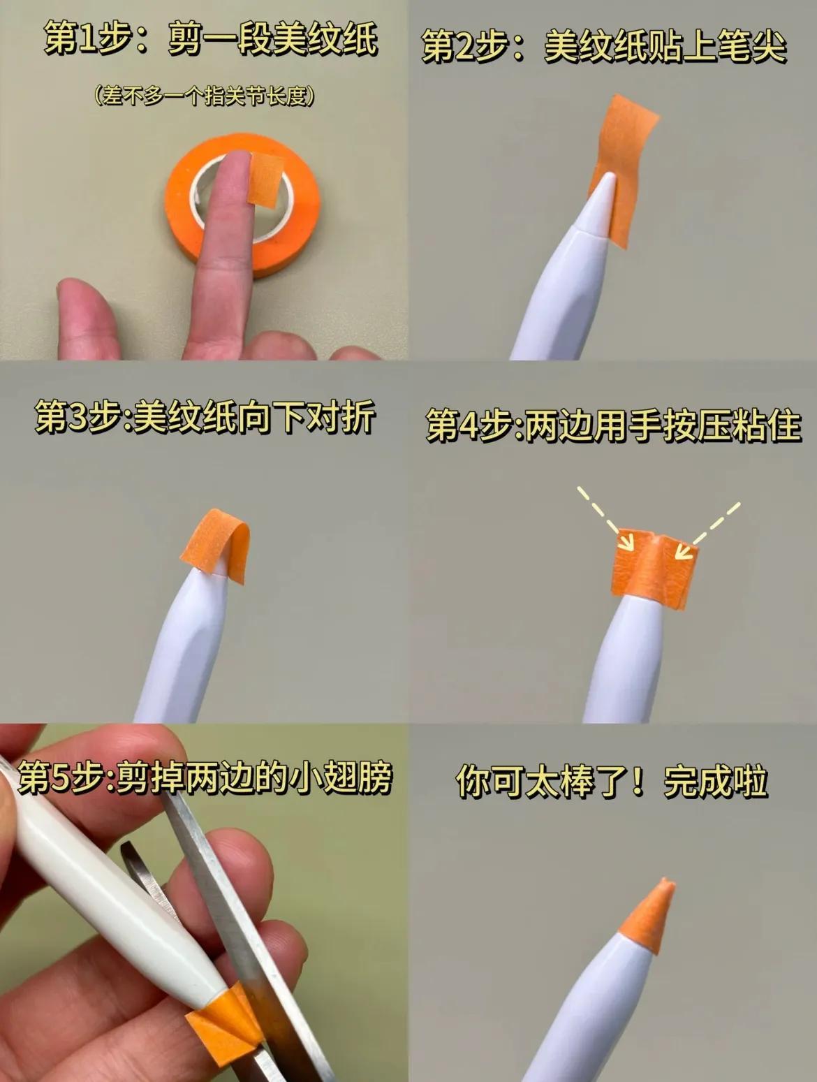 用剪刀剪下一小段美紋紙,大概是筆尖的雙倍長,然後對摺在筆尖上,兩邊用手按壓粘住,再剪掉兩邊多出來的部分,像給筆尖穿了一件合身的小衣服。