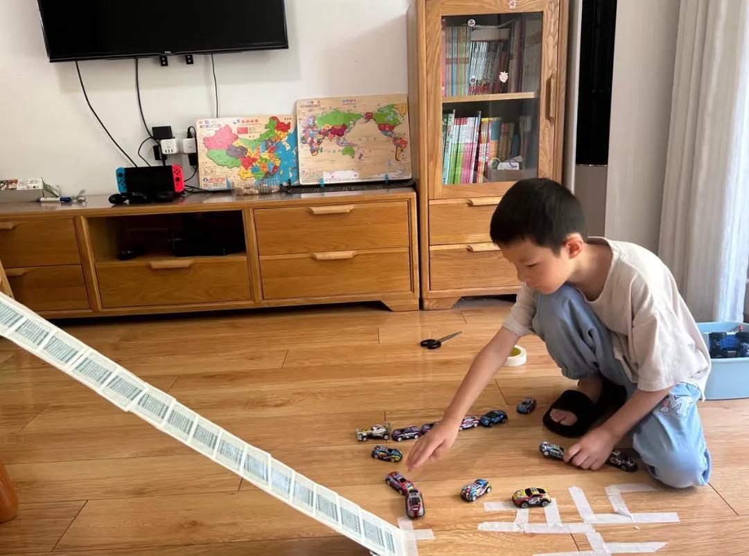 如果是酷愛車車的男孩,就沿着桌子貼兩條到地上,然後用撲克牌或者廢紙填充,造出一座跨海大橋,底下再貼出停車場,娃能玩的不亦樂乎,當媽的完全可以脫身做其它事。