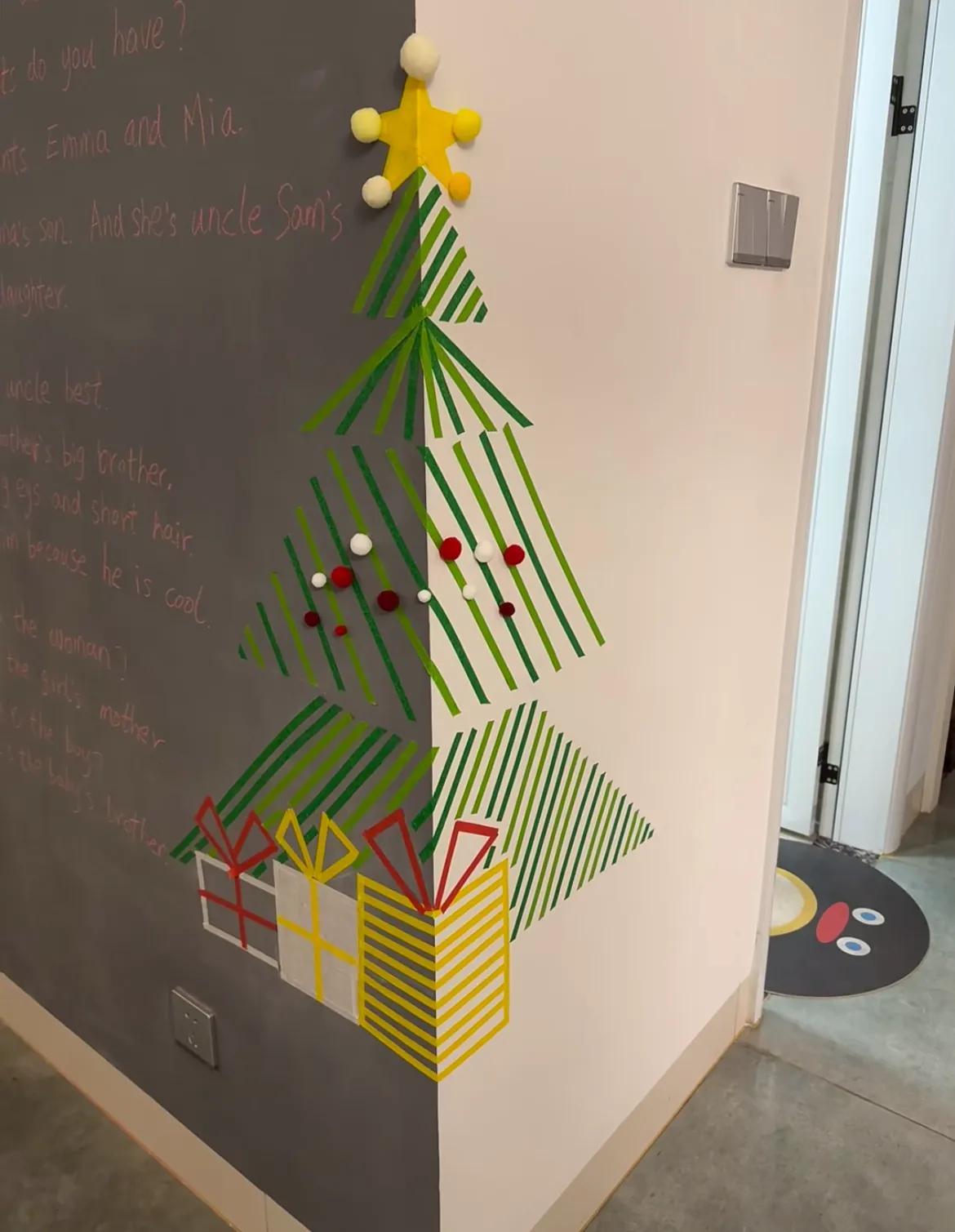 過聖誕節時,她是用不同顏色的美紋紙,在牆面上不僅粘出了聖誕樹,還粘了一堆禮物盒,主打一個一分錢不花,也能開心過節,真的太牛了。