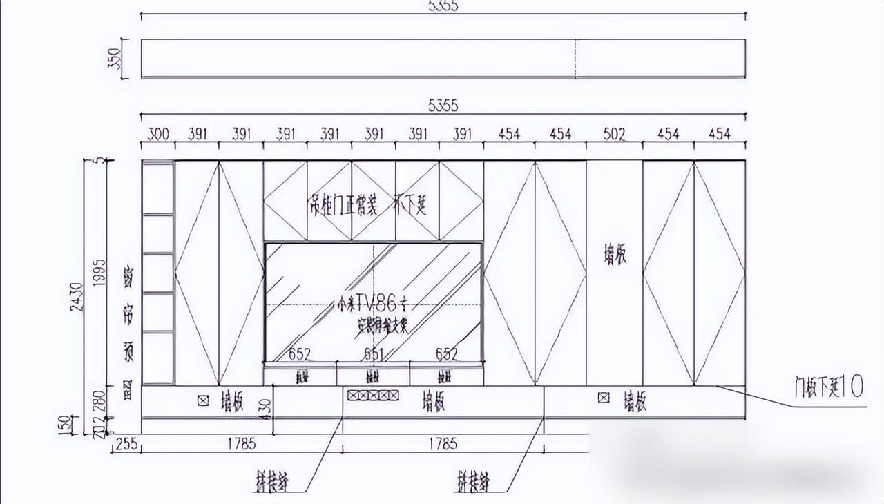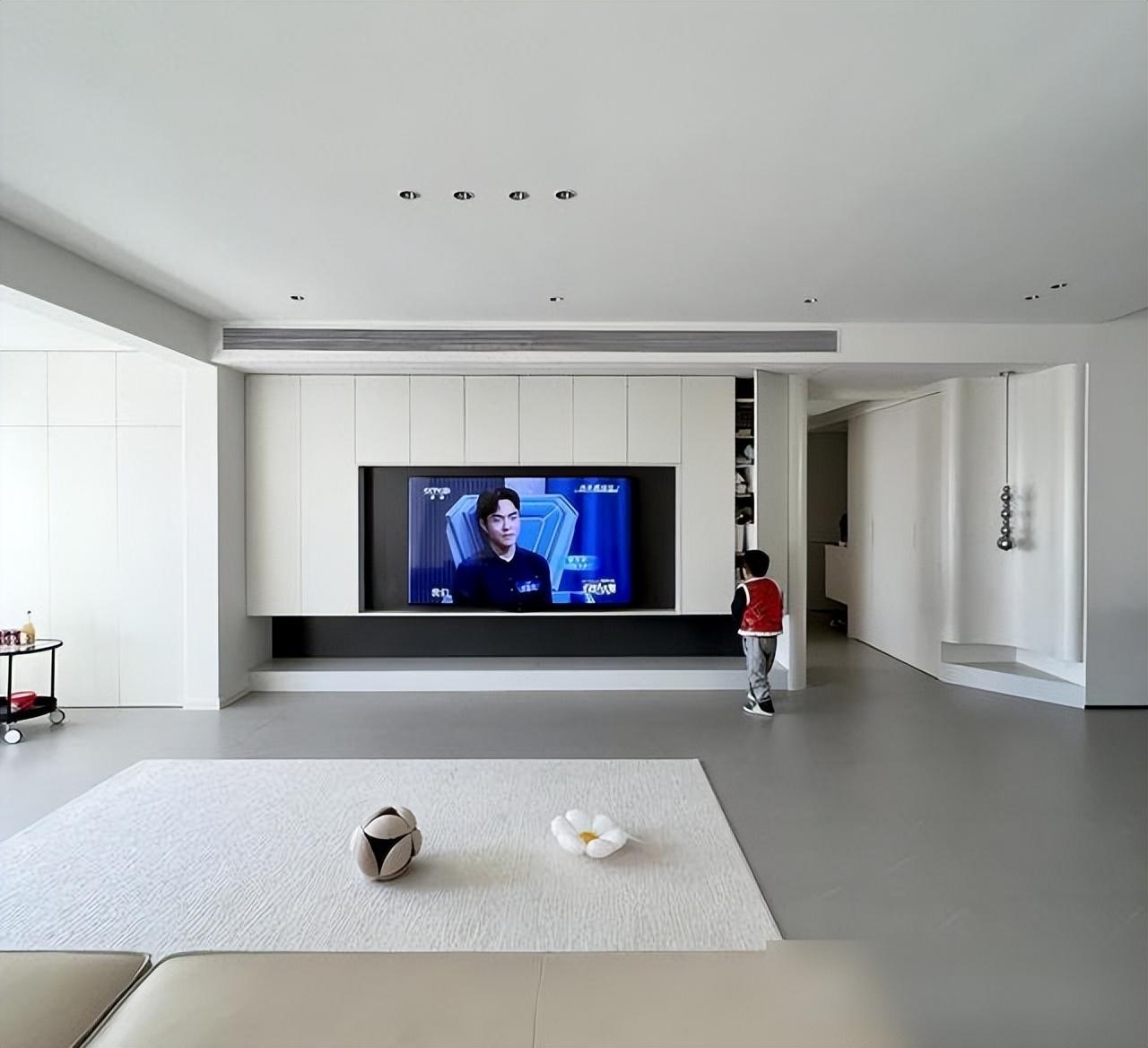 開間不足4米照樣能做,深度控制在35公分左右,電視區掏空裝伸縮支架,85寸大屏照樣塞進去。