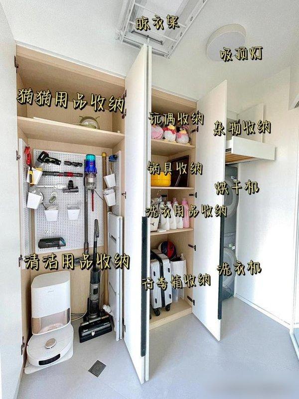 2平米空間做成通天櫃,洗烘套裝疊着放,上方裝抽拉晾衣杆。