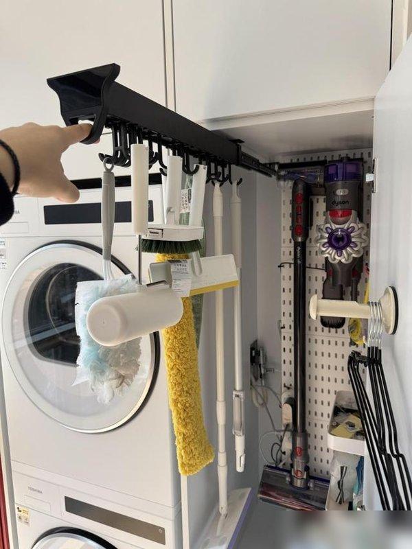 洞洞板掛滿清潔工具,抽拉褲架懸掃把,縫隙塞進摺疊梯。