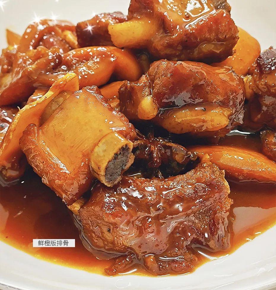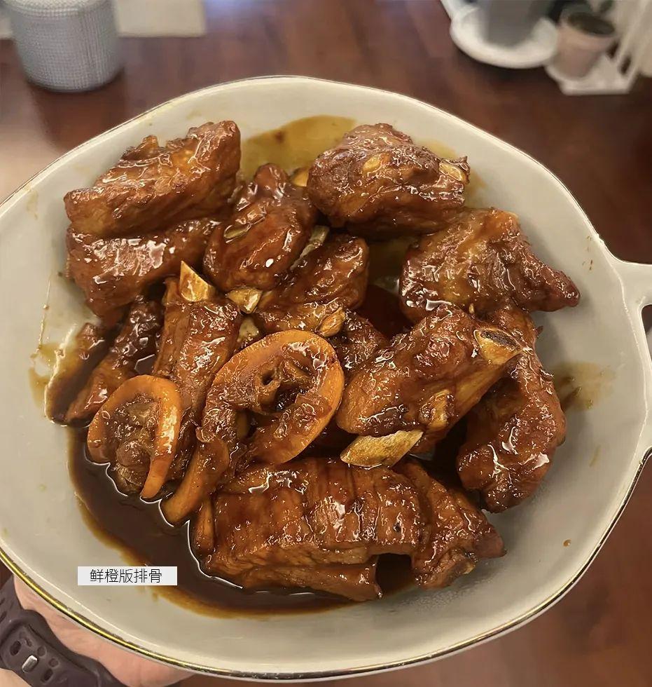 排骨先正常焯水,倒油+薑片煎到兩面黃,然後倒入棒打鮮橙,再加生抽、老抽、一丟丟鹽,小火燜煮45分鐘,燉到湯汁收得差不多即可。