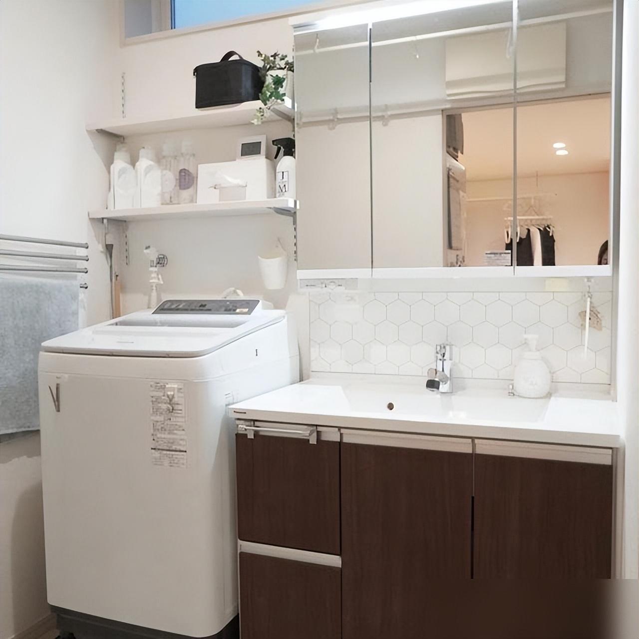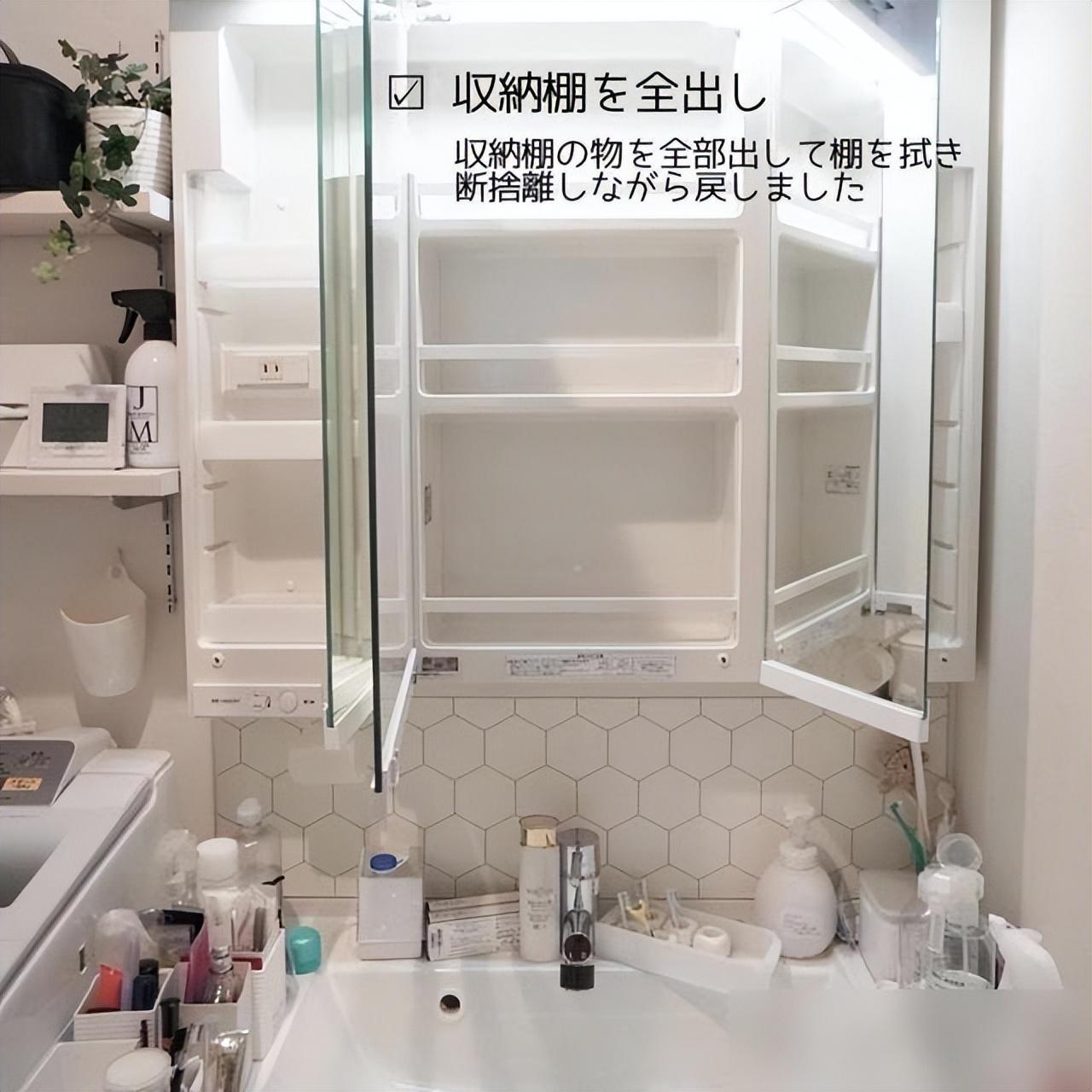 洗漱間的收納也有巧思,壁櫃裏的護膚品每隔幾天就拿出來查一遍,過期的、用不完的直接扔,剩下的按常用程度擺:洗面奶放在第一層,面膜放在上層,找的時候不用翻半天。