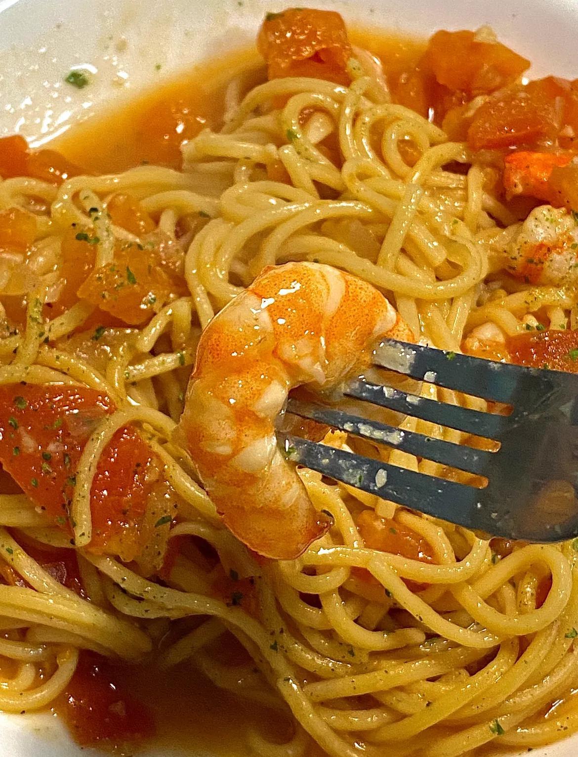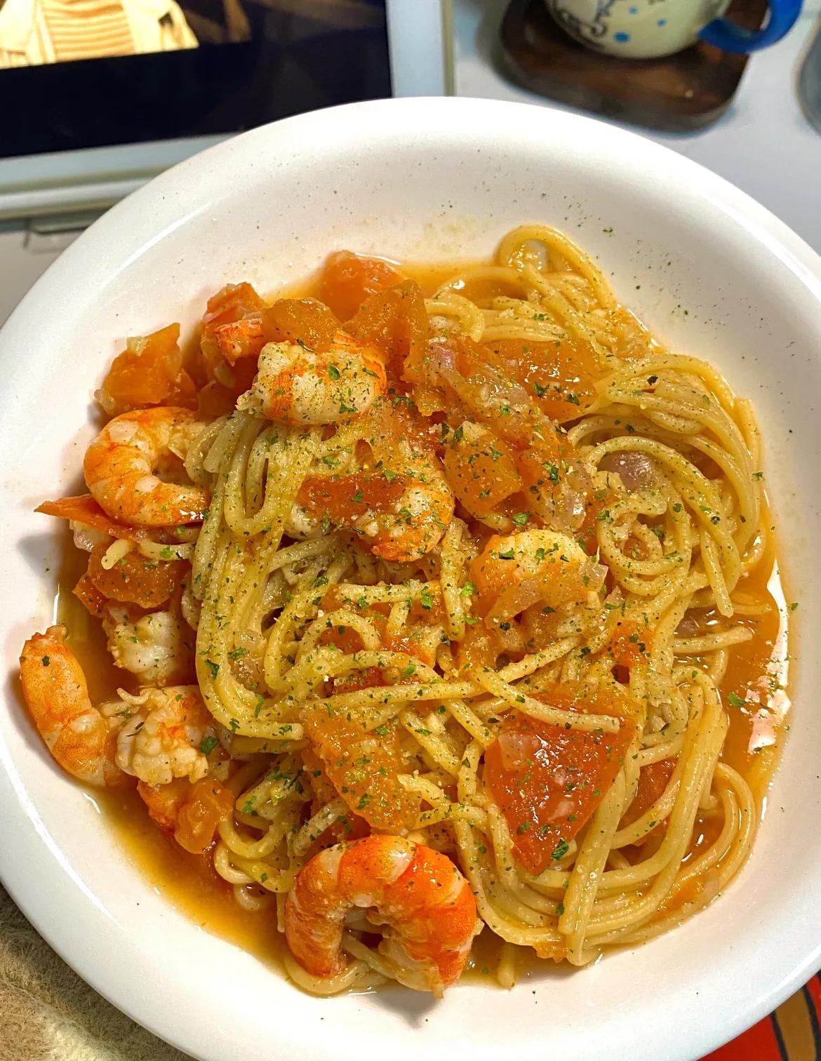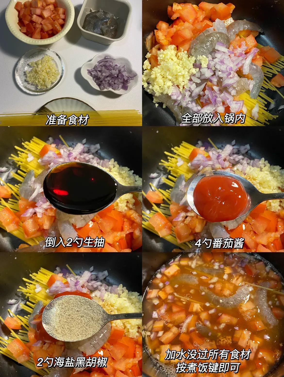 做法也簡單:意麪折斷扔進電飯煲,加洋蔥、番茄、蝦肉等意麪常規配菜。
