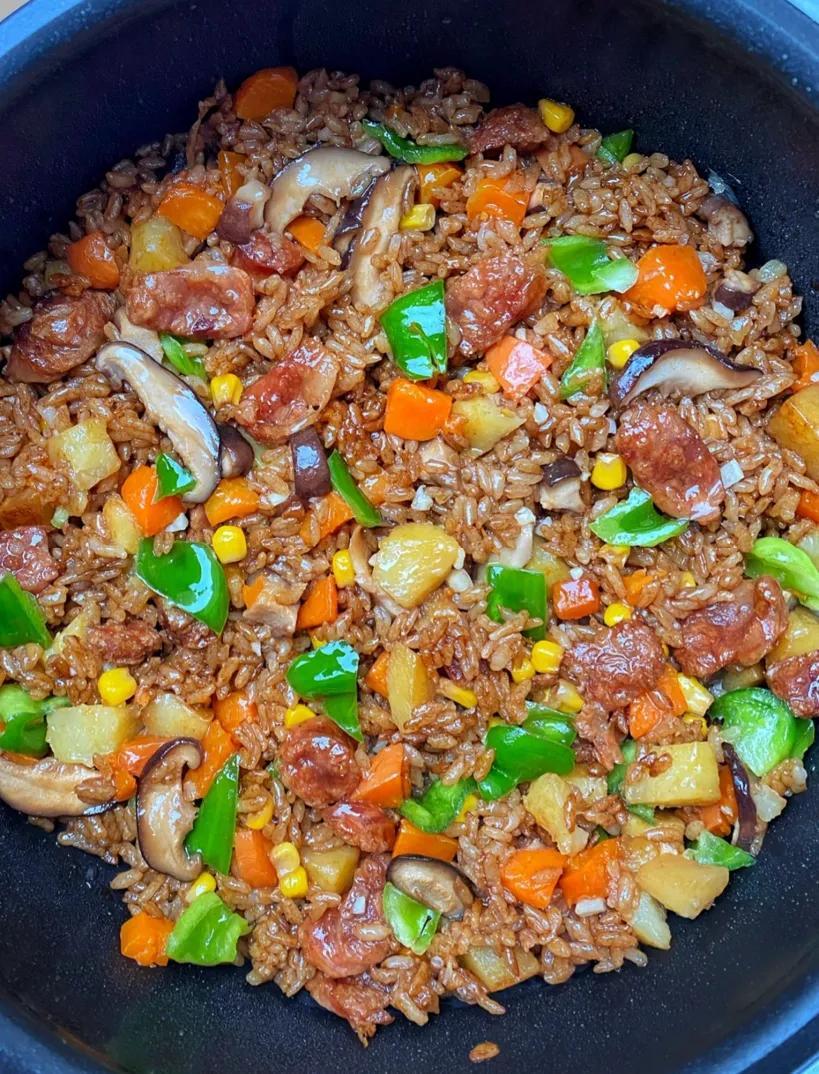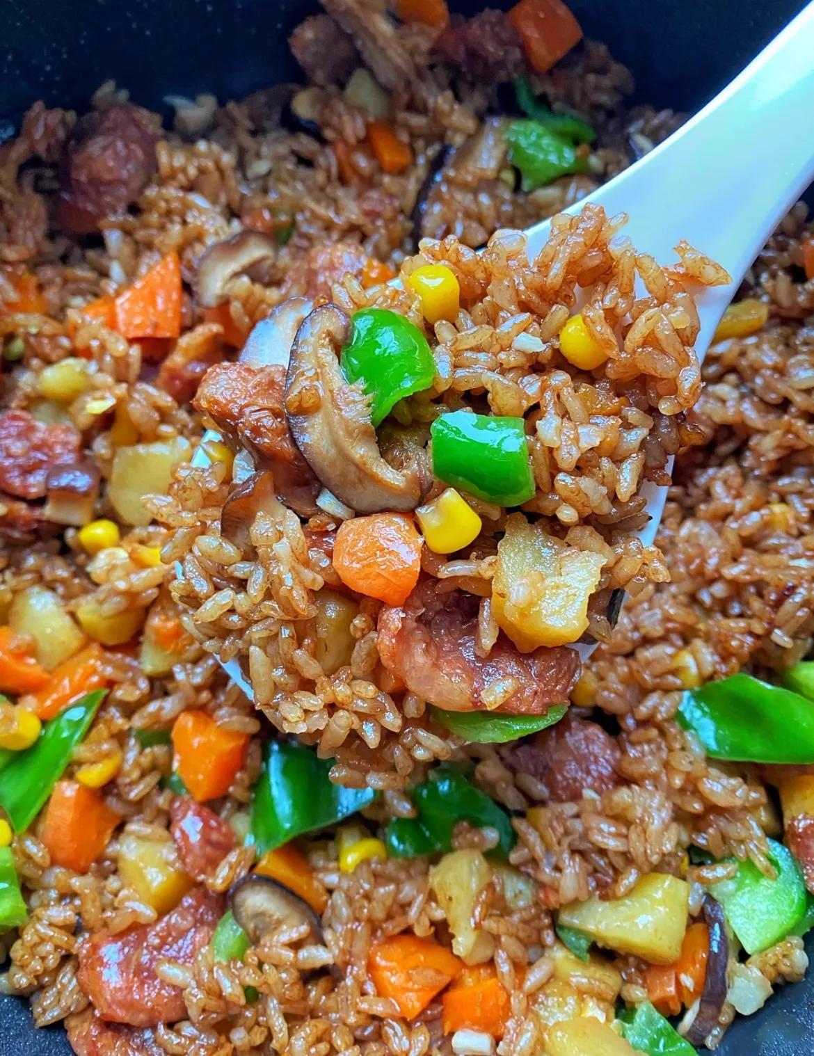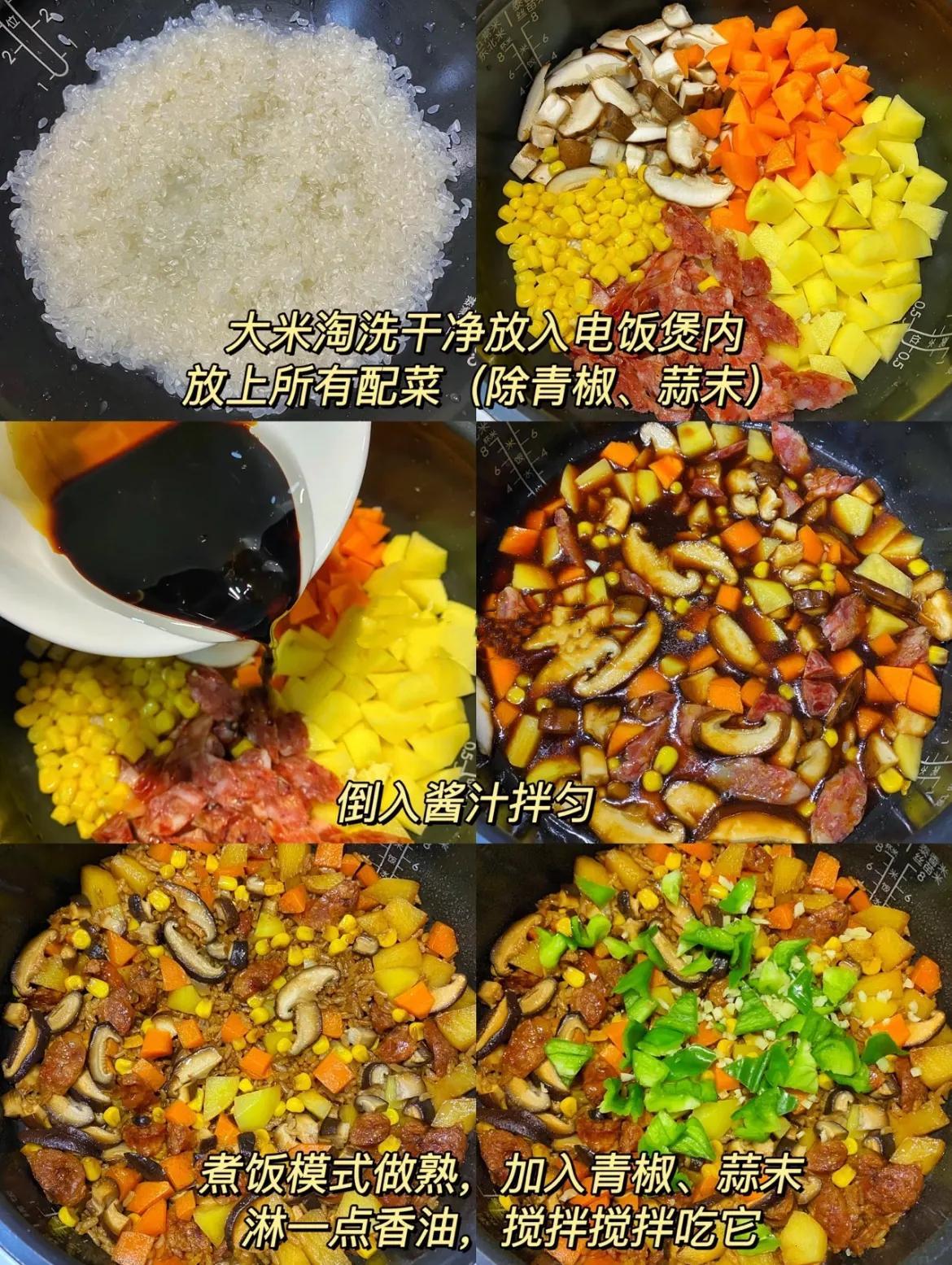 做法也簡單:跟平時蒸米飯一樣,米和水加好後,水裏加點生抽、耗油、香油攪勻,再加入玉米粒、香菇片、臘腸、胡蘿蔔、青豆、土豆丁.....喜歡啥放啥!