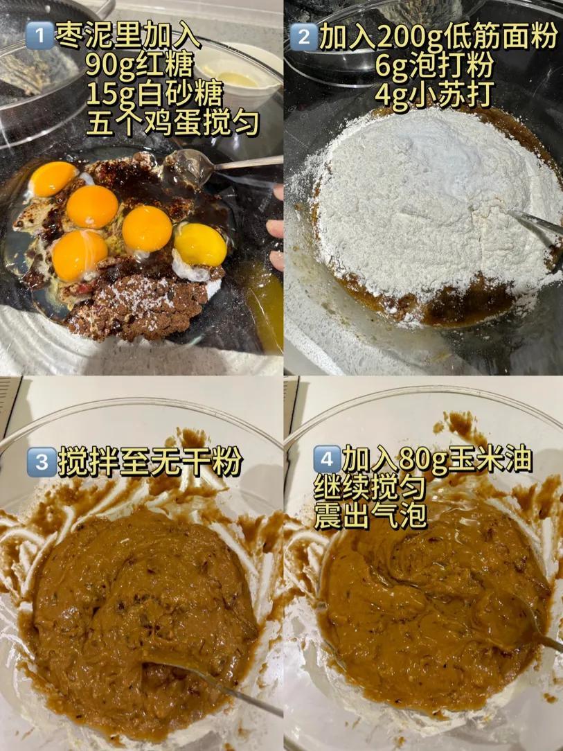紅棗去核切碎,加牛奶熬成棗泥,懶人也可以像我一樣,先按一次煮飯鍵,晾涼之後加雞蛋紅糖麪粉、小蘇打、泡打粉攪拌均勻,倒入電飯煲按“煮飯鍵”。
