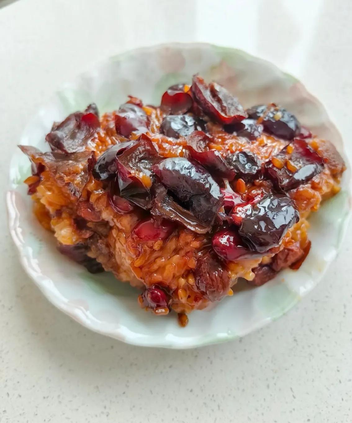 是的,你沒聽錯,網友@是元寶媽媽啊就用紅棗、芸豆、葡萄乾、糯米做起了電飯煲版甑糕。