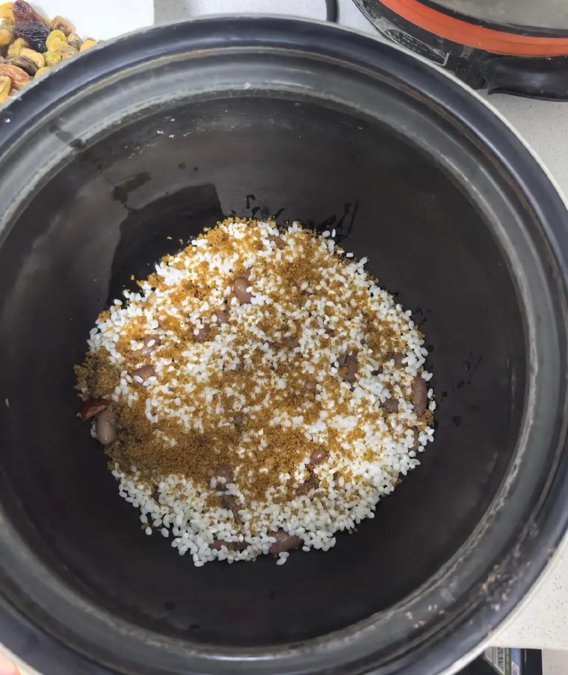 紅棗、芸豆、泡好的糯米、紅糖、葡萄乾,一層層鋪好,最後以輔料封頂,注意鋪的時候不要壓緊,輕輕地鋪,熟的更快。