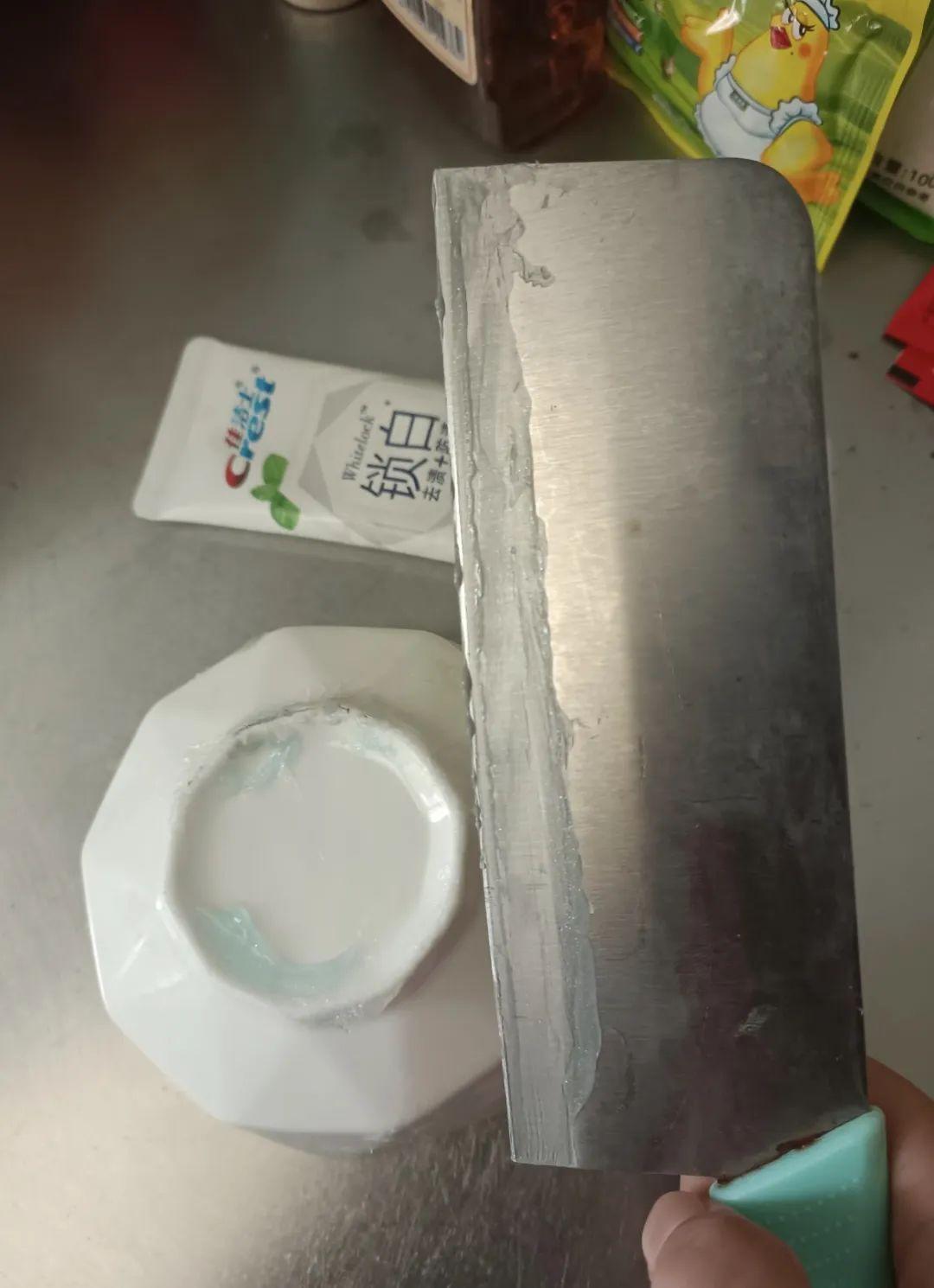 先擠牙膏在鏽跡處, 放在碗底來回蹭,鏽多的地方多搓幾秒,不能當能除鏽,還能讓刀變得更鋒利。