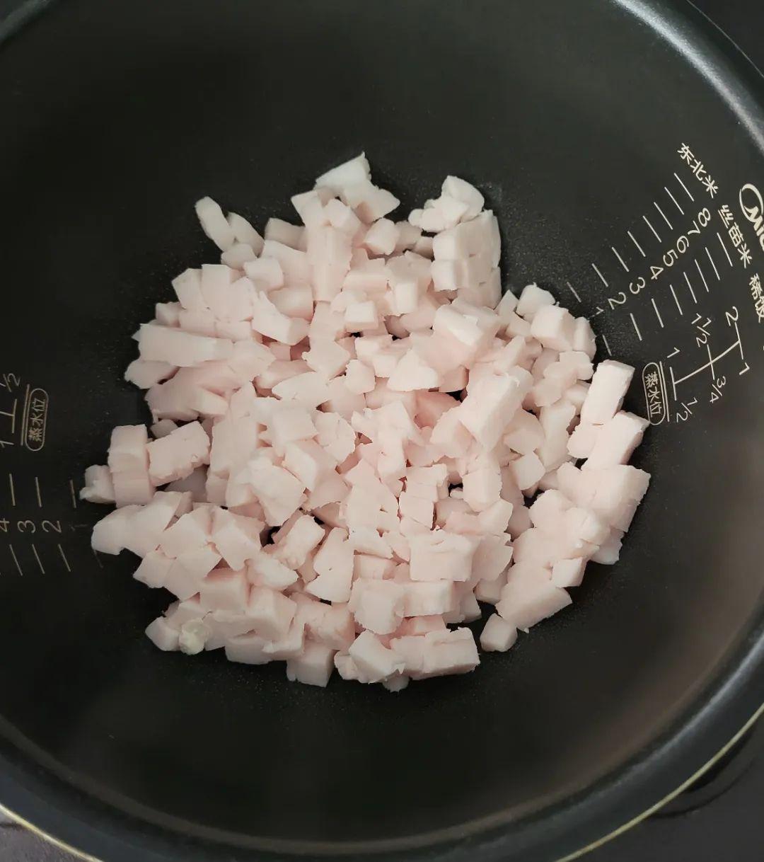 把豬板油切成小粒,扔進電飯煲,加小半碗水,按下煮飯鍵就能翹着二郎腿追劇去了。