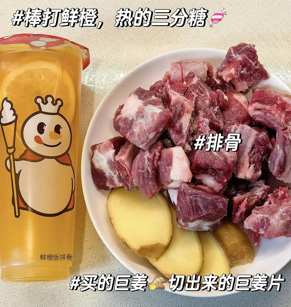排骨先正常焯水,倒油+薑片煎到兩面黃,然後倒入棒打鮮橙,再加生抽、老抽、一丟丟鹽,小火燜煮45分鐘,燉到湯汁收得差不多即可。