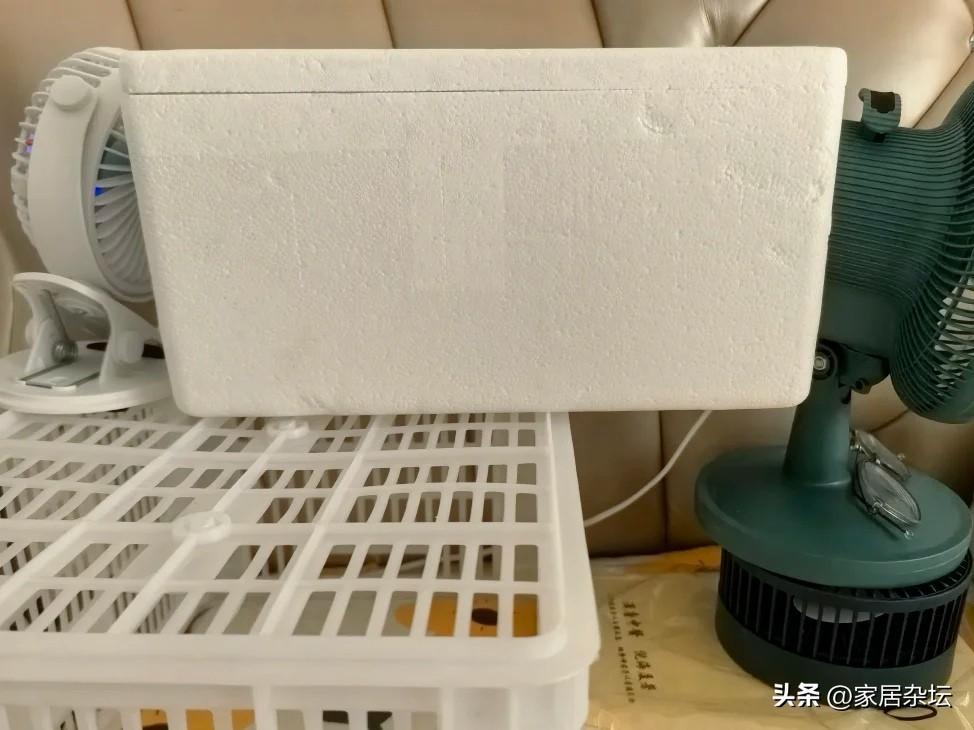 只需要找一個大小適中的泡沫保溫箱,在側面開一個圓形的風口。之後,將小型風扇固定在風口處,確保風向箱內吹。