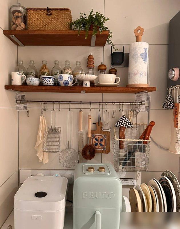 還有牆面開放格,之前聽人說吊櫃壓抑,拆了做開放格顯大,結果現在上面擺的調料瓶、馬克杯,天天落灰就算了,炒菜的油星子濺上去,擦的時候得用洗潔精泡十分鐘,反而比吊櫃麻煩;更氣人的是開放格根本裝不下多少東西,之前吊櫃能放的鍋具現在堆在臺面上,廚房更擠了——早知道搭個升降拉籃多好,夠得着還能藏起來,哪用得着現在天天收拾。
