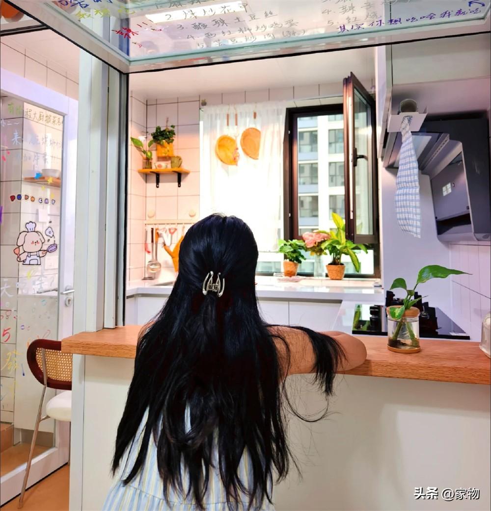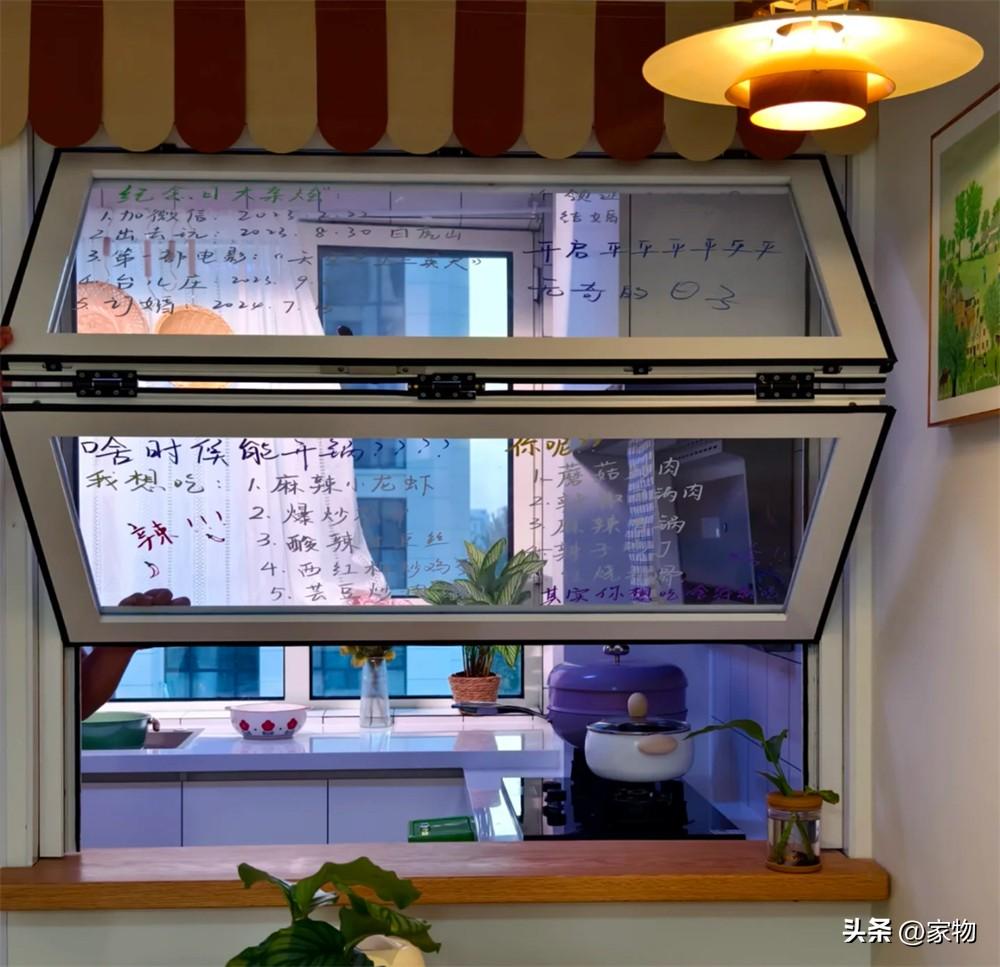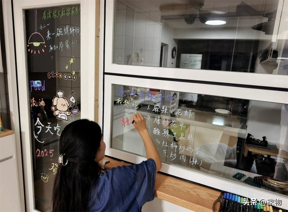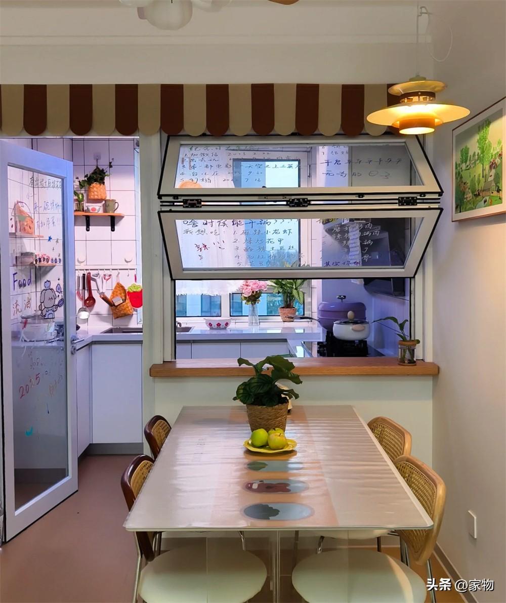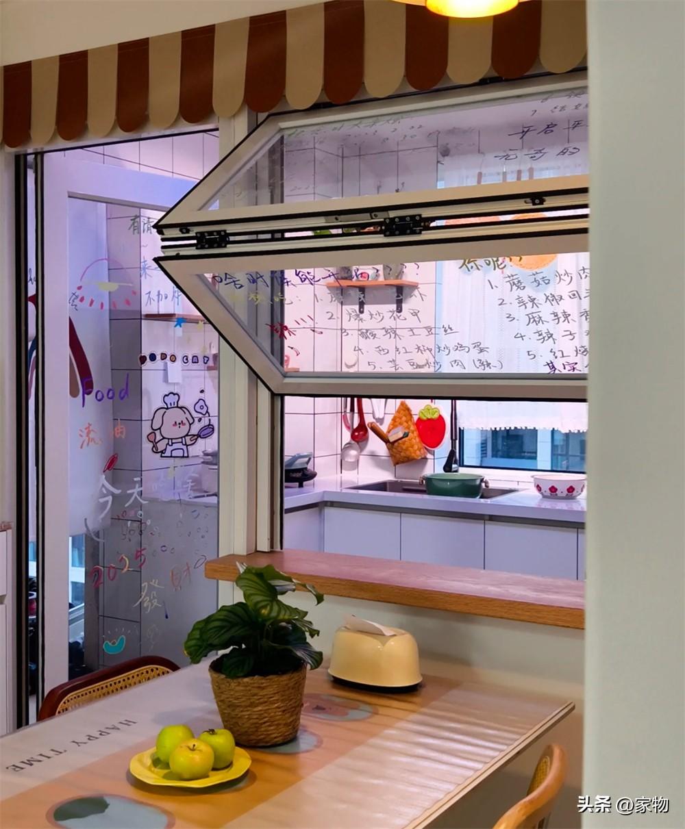 有趣的是,這家人還直接將疊窗的透明玻璃當成了一面書寫板,可以將想要喫的菜品,或者是提醒家人的備忘寫在這面玻璃窗上,用不同顏色的油性筆寫上去,相當於是個廚房和餐廳中間的可愛裝飾,一舉兩得。