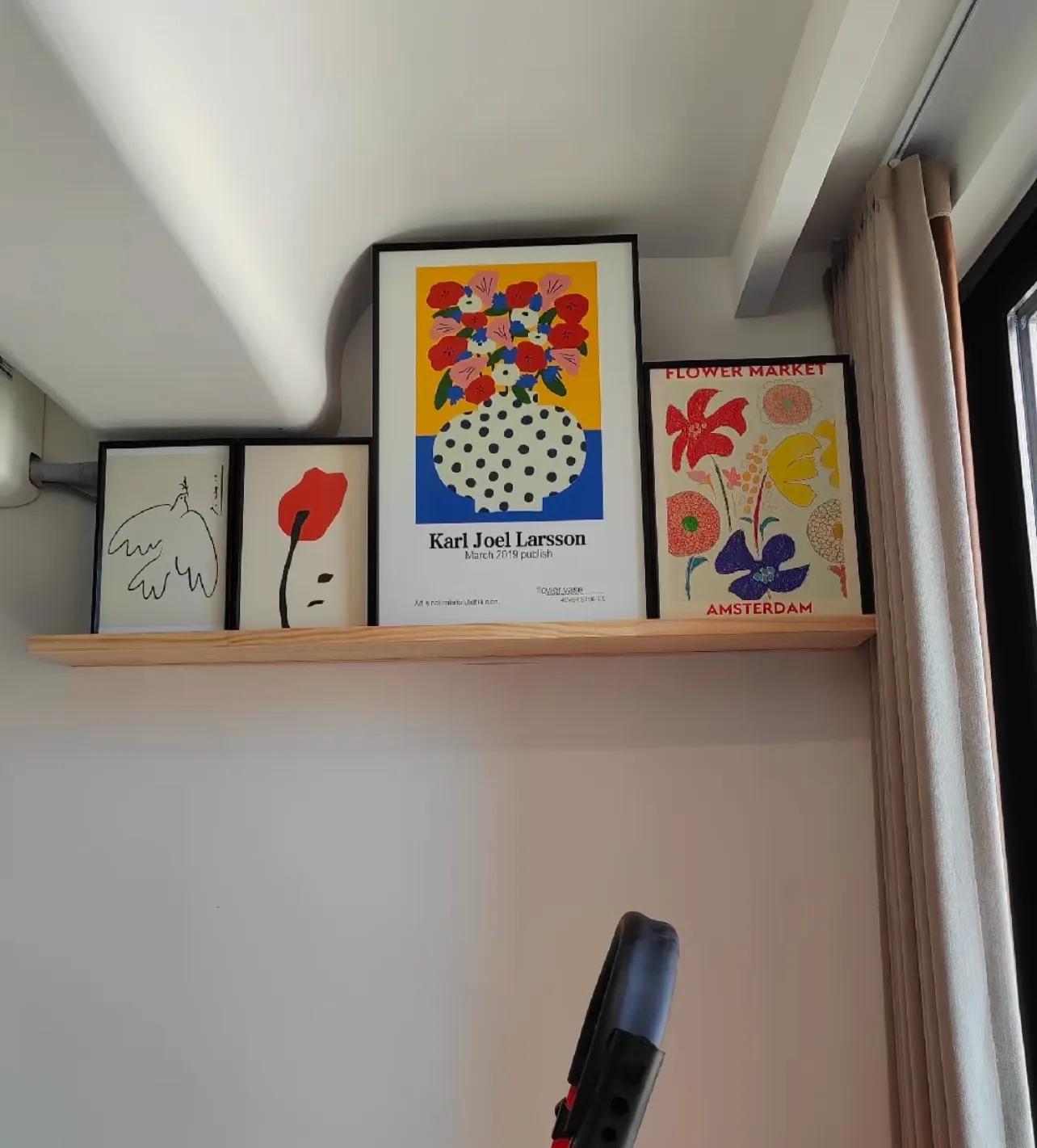 下面是置物隔板,上面放上喜歡的畫或海報都可以,也不用打孔,效果還不錯。