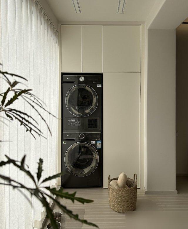 寬度夠的話,試試冰箱門設計:櫃門分層收納,洗衣用品一目瞭然,背面還能做薄櫃囤紙巾。