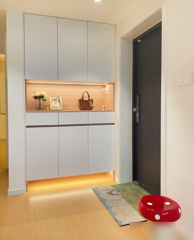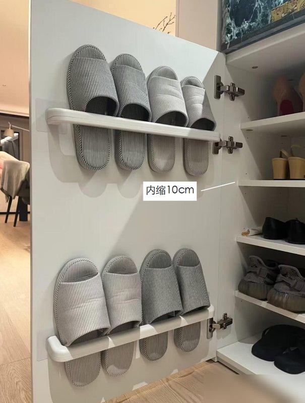 換個角度想,如果深度做到40-45cm,層板內縮個10-15cm,櫃門上安個輕巧鞋架,拖鞋就有專屬位置了。