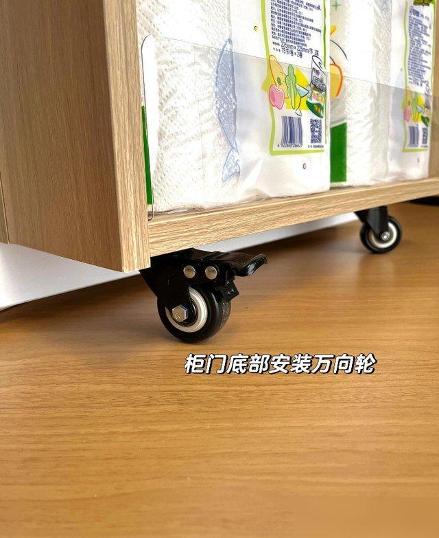 同樣內縮層板18cm左右,櫃門加亞克力擋板和萬向輪,雜物分類放好,開門穩穩當當。