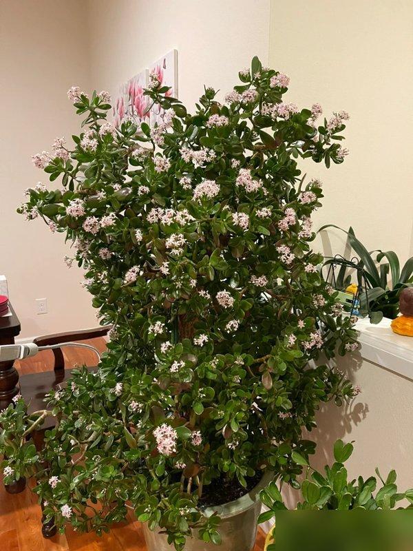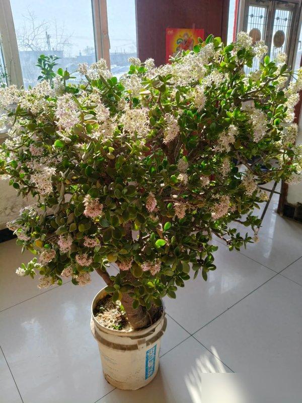 20年啊,一盆玉樹從巴掌大的苗長成比人還高的老樁,枝椏上全是歲月的印子:有一年冬天忘搬進屋,凍得掉了半樹葉子;有一年孫子調皮,掰了根枝子插在別的盆裏,現在也長成了小樹苗;還有爺爺每天早上搬它出去曬太陽的背影,蹲在旁邊拔草的樣子,下雨時給它蓋塑料布的認真——這些碎碎的日子,全攢進了枝椏裏,纔開得出這麼密匝匝的花。