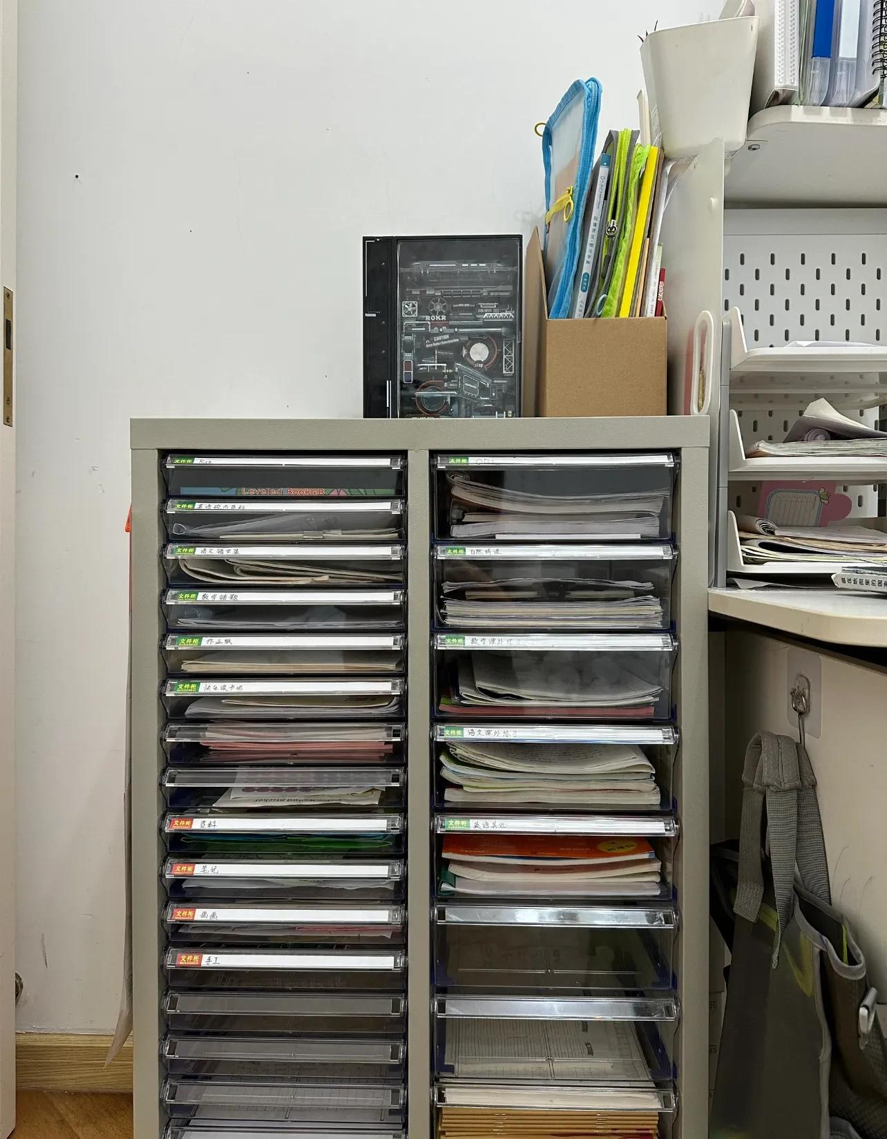 上小學後,學習資料逐步增加,全靠這個鐵皮抽屜櫃,顏值高又耐用,簡直是收納界的天花板!