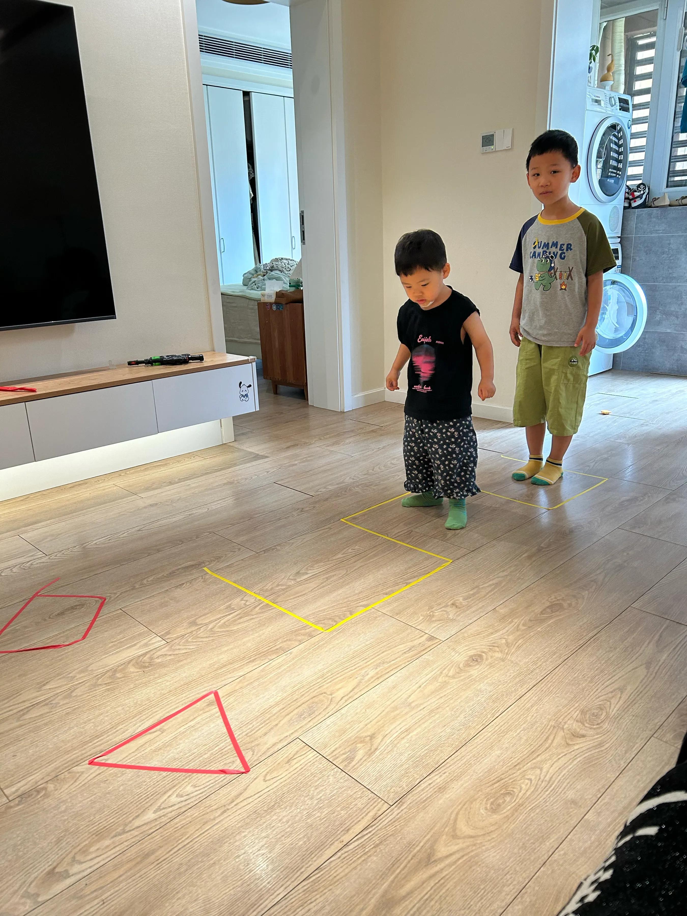 孩子在地上用美紋紙貼跳房子的格子,完成後兩娃盡情跳躍,每跳一步,都是歡樂和挑戰。