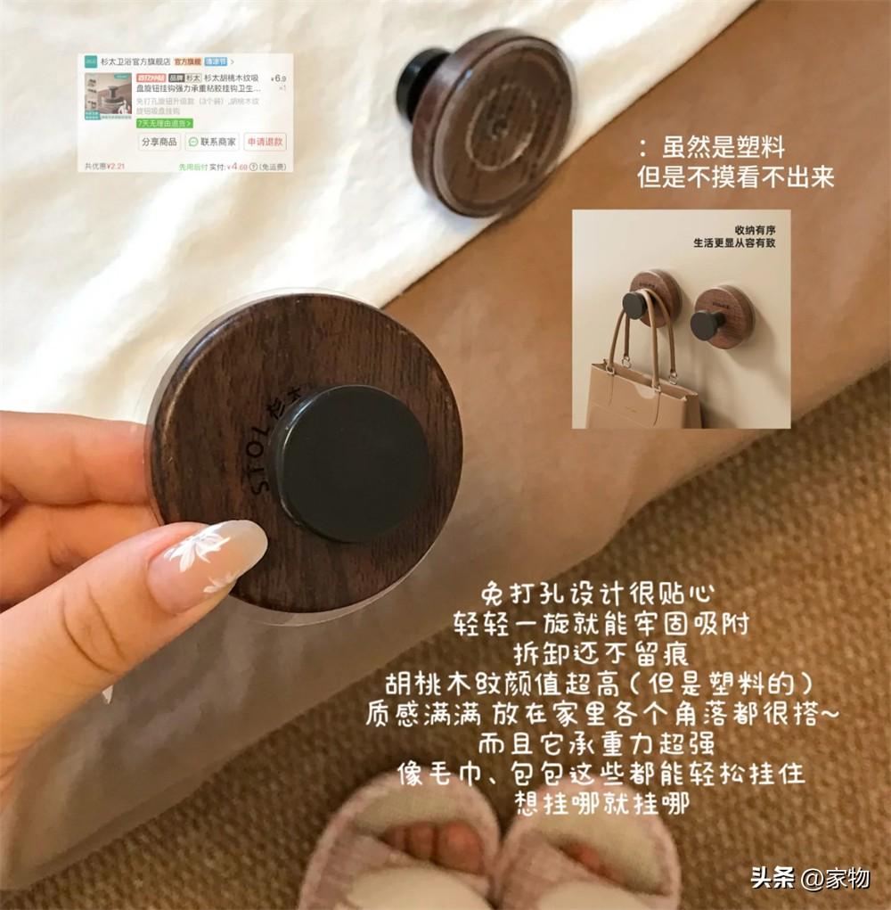 別看是塑料的,但即便近看,只要不拿在手裏,看起來就像是黑胡桃木一樣,平時掛些手提袋或者包包之類的東西也很穩當,真的很好用。