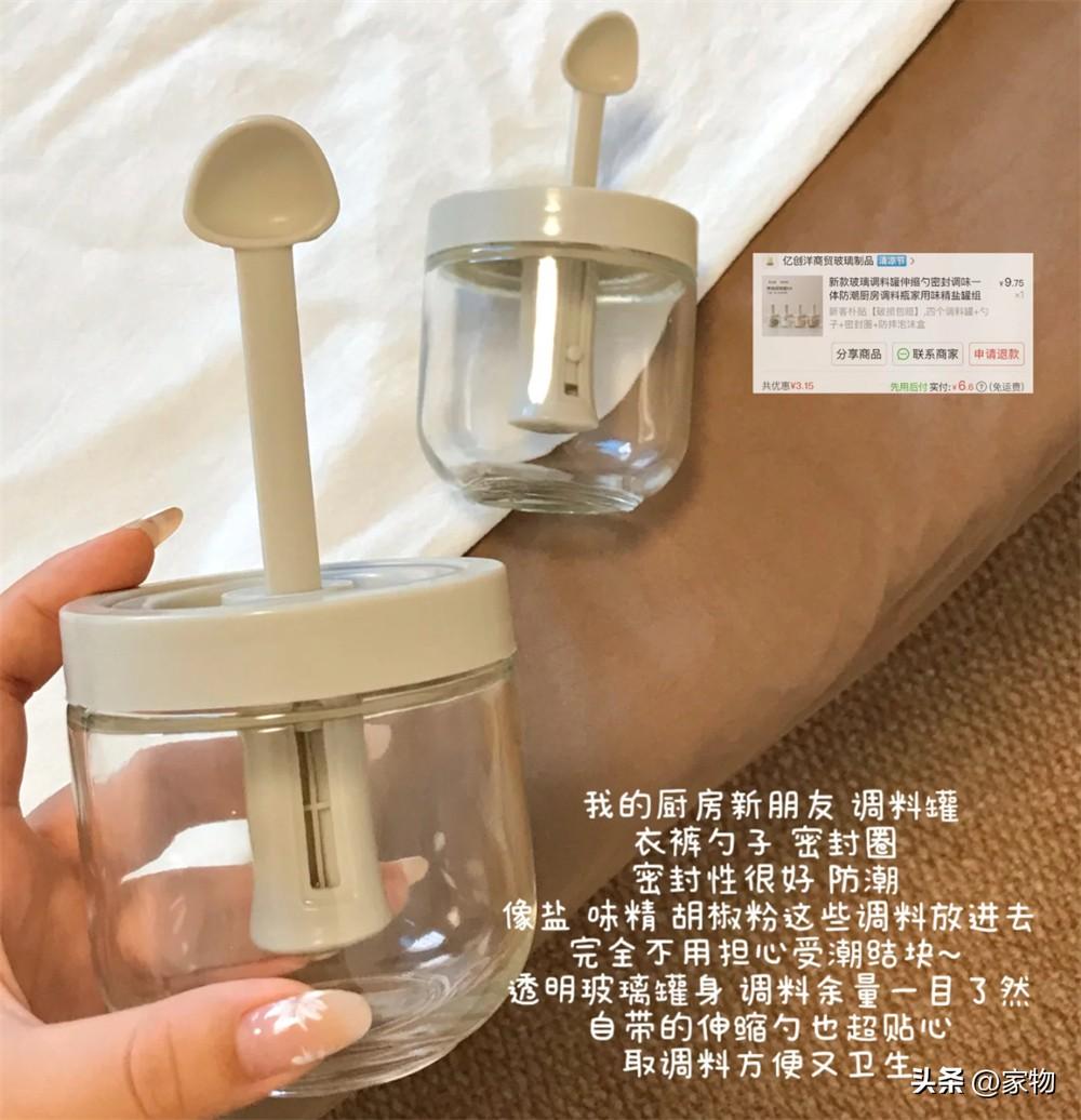 我在用了一個遍後,終於找到了我個人感覺最爲實用的廚房調料罐——就是這個自帶伸縮勺的小罐子,它比起那些直接將勺子插在瓶子裏的調味罐來說,更不容易因爲受潮結塊而導致勺子插不進去、蓋不上蓋。