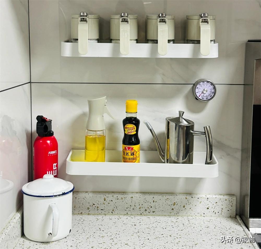 還有那種牆面式的收納架,也可以根據吊櫃和檯面中間的高度,安裝上那麼一兩個,同樣可以放廚房裏的各種瓶瓶罐罐等調味品,釋放檯面空間,平日裏擦拭檯面清潔時,相對來說會更加輕鬆一些。
