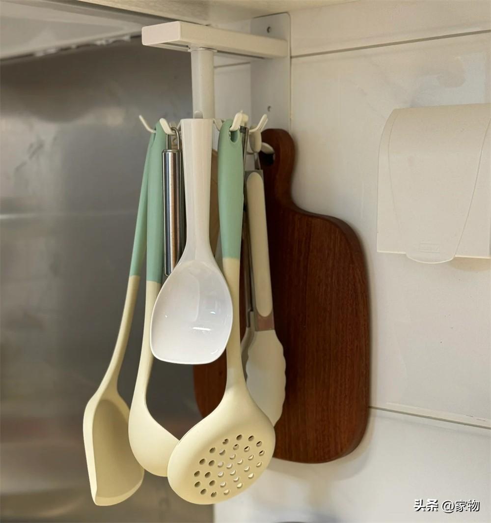 同樣能起到節省空間效果的,還有這種八爪魚掛鉤,用起來同樣很簡單,只需要貼在牆上就行,底部的掛鉤就像八爪魚腿,可以掛一圈餐具廚具,要拿的時候旋轉一下就行,格外節省空間,也非常方便拿取。