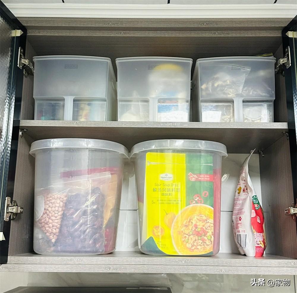 吊櫃裏,則用一些較大的塑料收納盒,來將各種袋裝的調味品或者廚房用品集中收納起來,一方面,歸類收納會顯得更加整潔明快一些,領一方面,這些不常用的備品,放到收納箱裏也能防塵防污,更爲妥當。