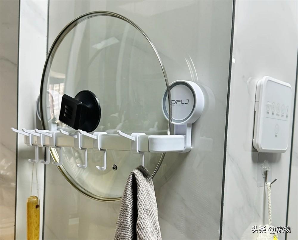 廚房煙道的位置,我貼了一個這種免打孔式的吸盤掛架,它既可以當作鍋蓋架放鍋蓋,又可以隨意移動上面的掛鉤,掛廚房抹布、刷子,或者是飯鏟粥勺之類的,都完全沒問題,實用性極強!