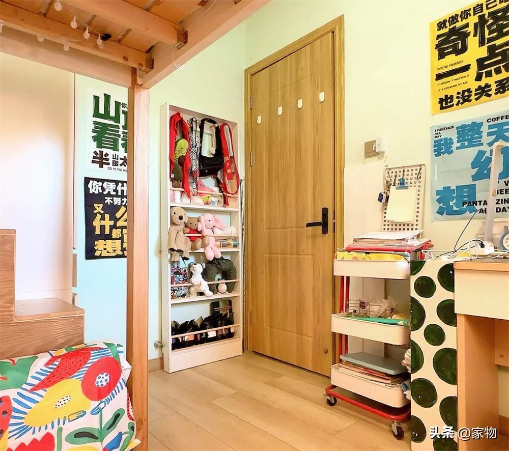 門後放極窄收納櫃,多層架身可以分別收納孩子的毛絨玩具、揹包、漫畫等各種雜物,打開門時便可隱藏在門扇後面,不顯山不漏水,爲兒童房內增加了額外的收納空間。