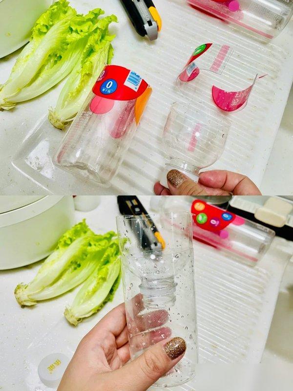喫烤肉剩下的生菜心別扔,留個三四片葉子,卡在倒扣的瓶口上,根部剛好碰水,菜葉泡不着——你說這設計是不是比設計師想的還巧?