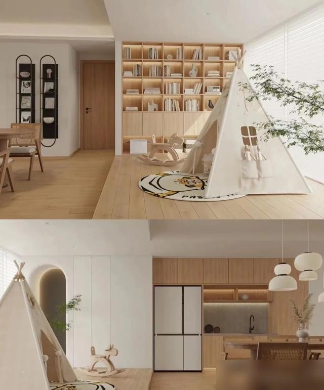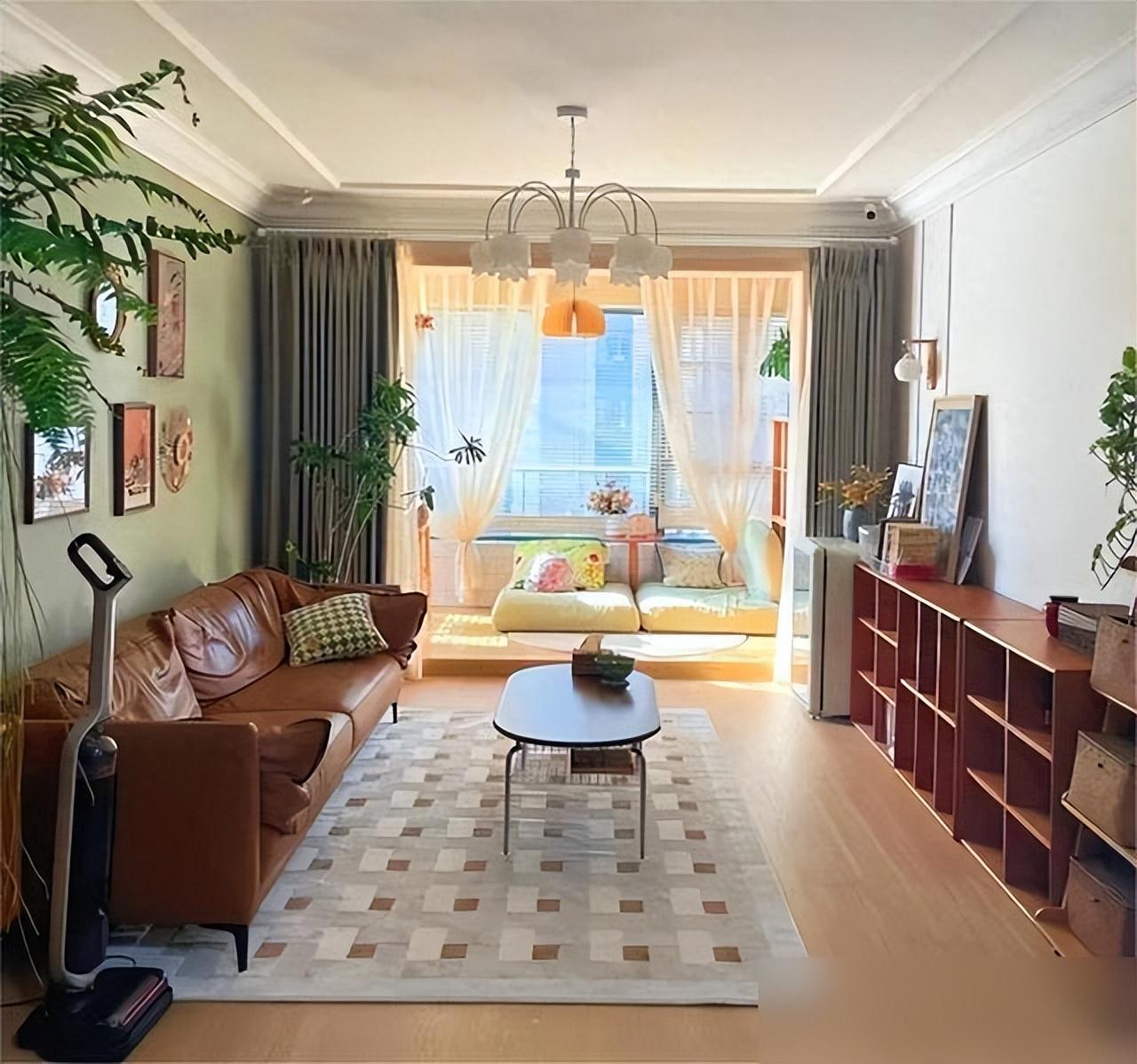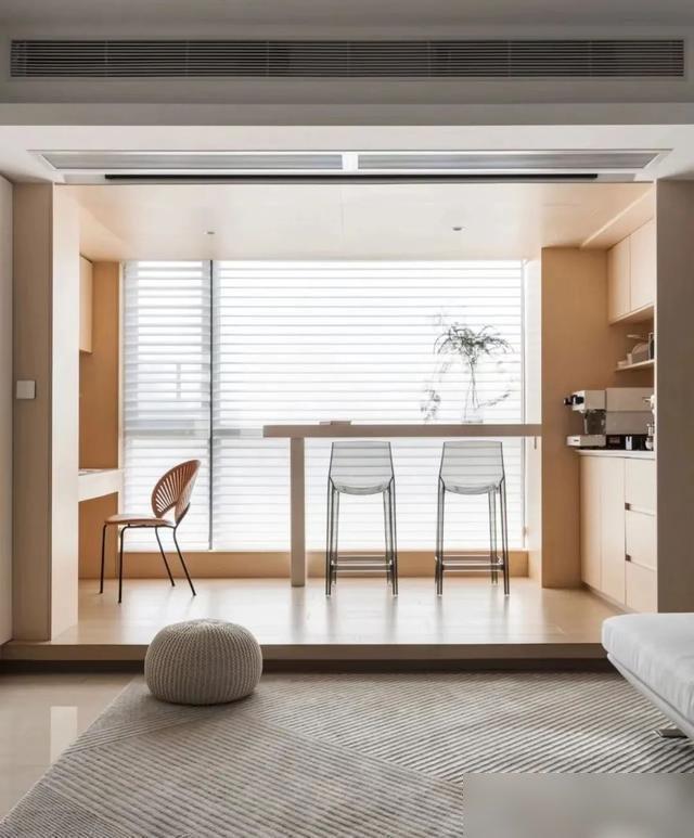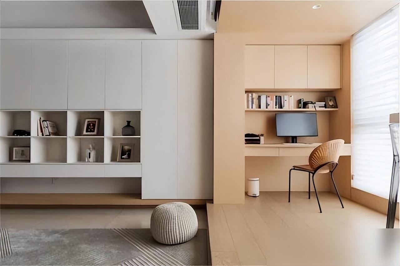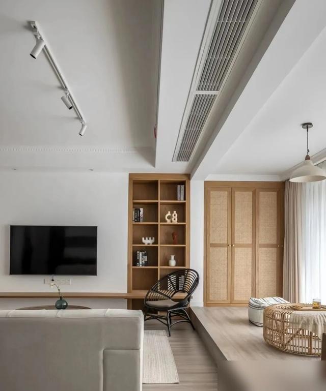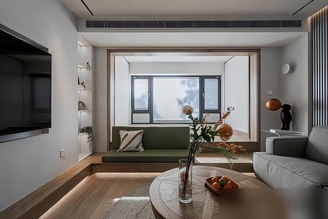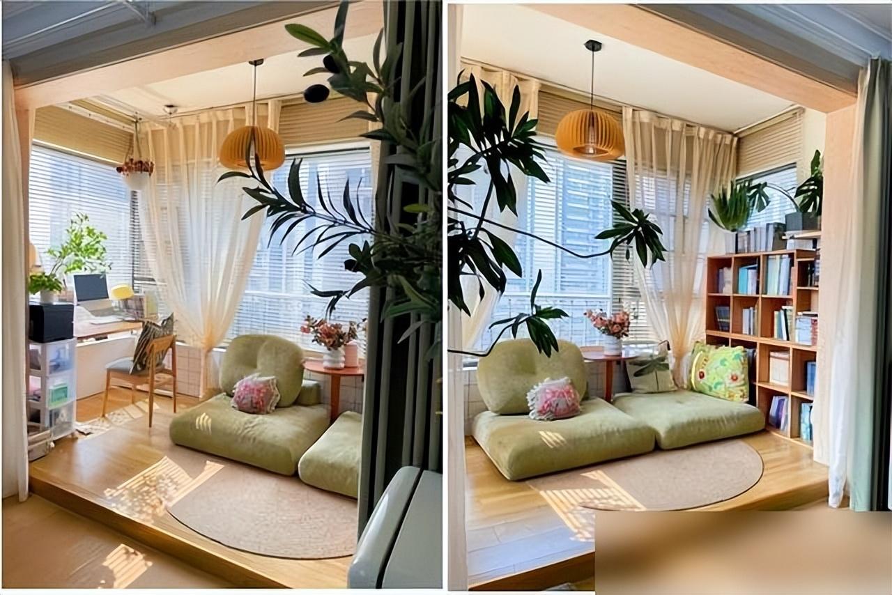 後來新房裝修,老公非說要封陽臺做地臺,我一開始擰着勁反對:“衣服不曬陽臺難道掛客廳?”結果裝完我臉打得比誰都快——陽臺和客廳打通,地臺抬了15公分,鋪淺胡桃木地板,擺兩個奶白懶人沙發,旁邊放張窄書桌,上面做了排開放式書架。
