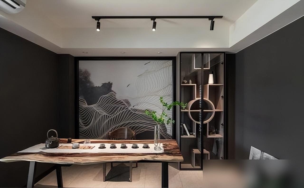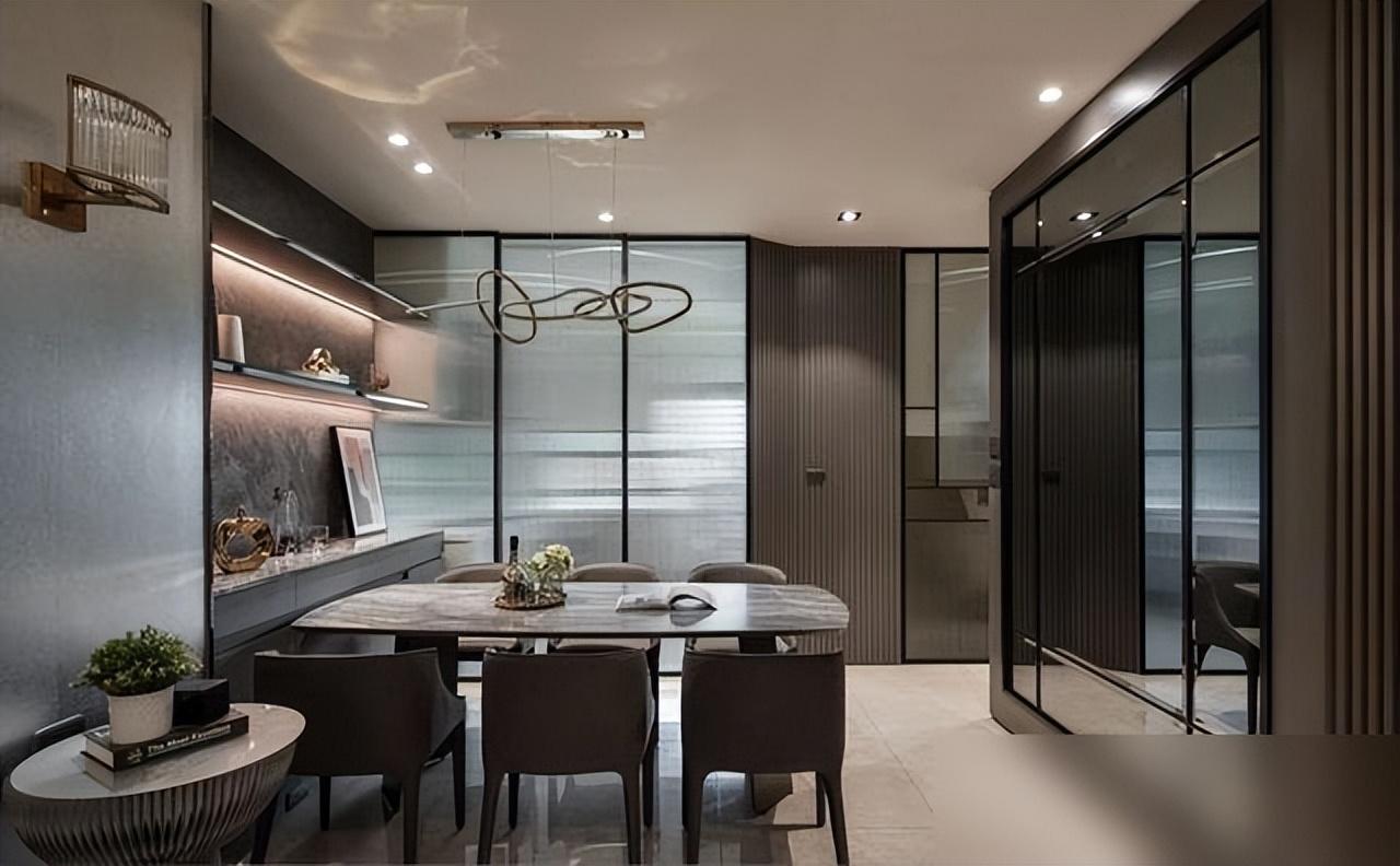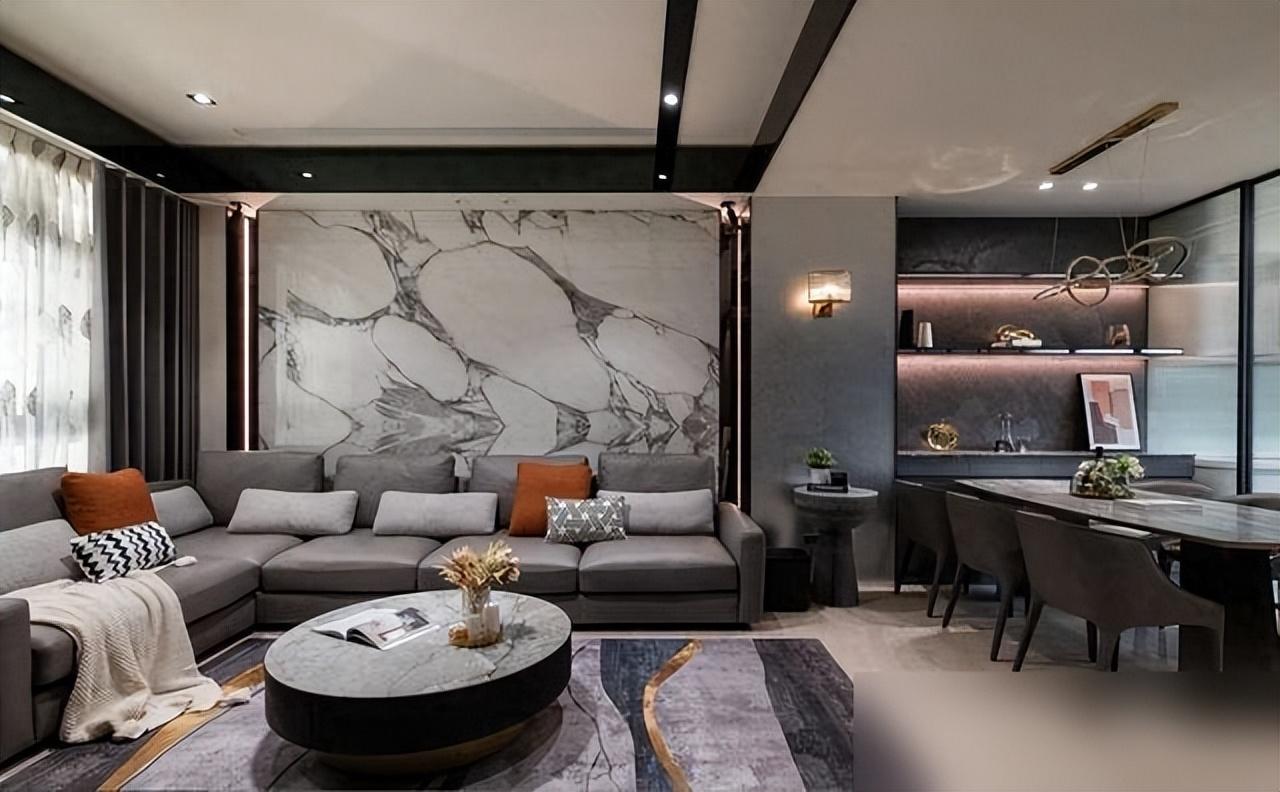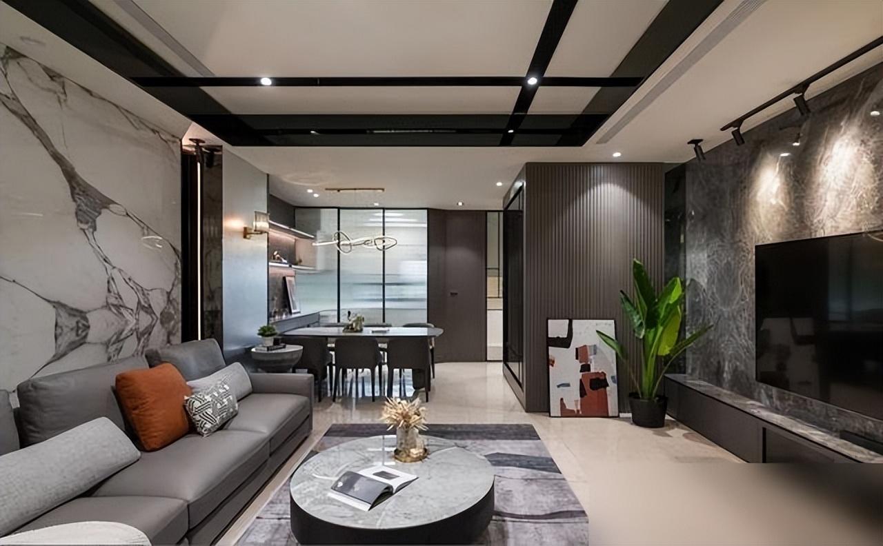屋裏用深色調打底,大理石電視牆配上金屬線條,厚重中跳出精緻感,像一件低調的高定西裝,遠看普通,近看全是細節。