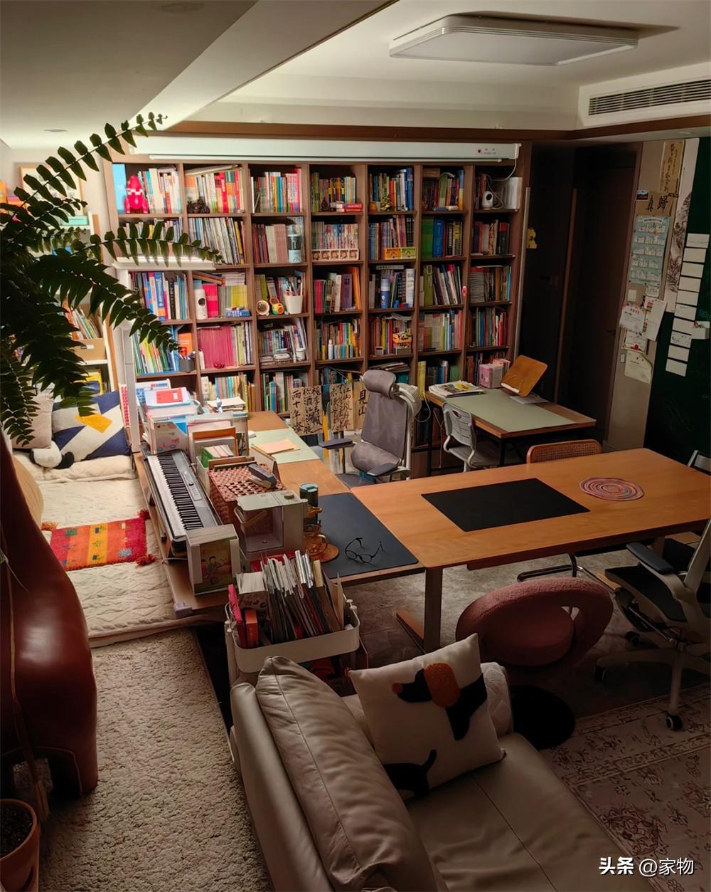 夫妻倆的“客廳工位”,也可以當成倆娃的玩樂區域,反正桌面較大,合圍空間佈置得又很靈活,別說這一家四口了,就是再多倆人,也完全坐得下,相比於傳統客廳來說,這種去客廳化的裝修顯然要靈活有趣許多。