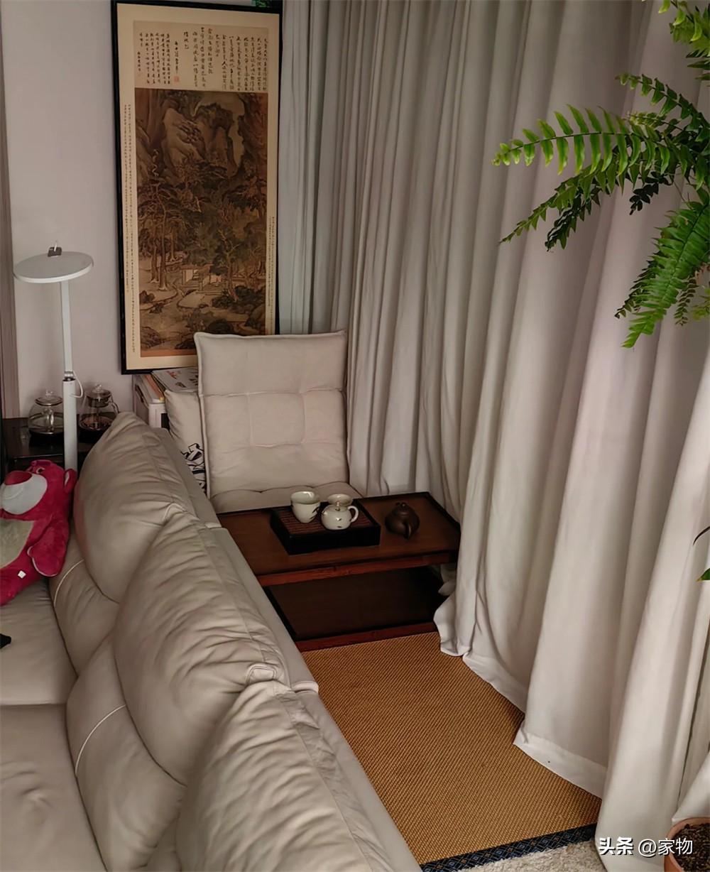 而沙發後面,則是夫妻二人對坐飲茶的休閒角,喝喝下午茶、聊聊心裏話,代替這間橫廳所沒有的陽臺,想來也是個很不錯的佈置方式,每一寸空間都有了它們應有的功能,半平米也不浪費!