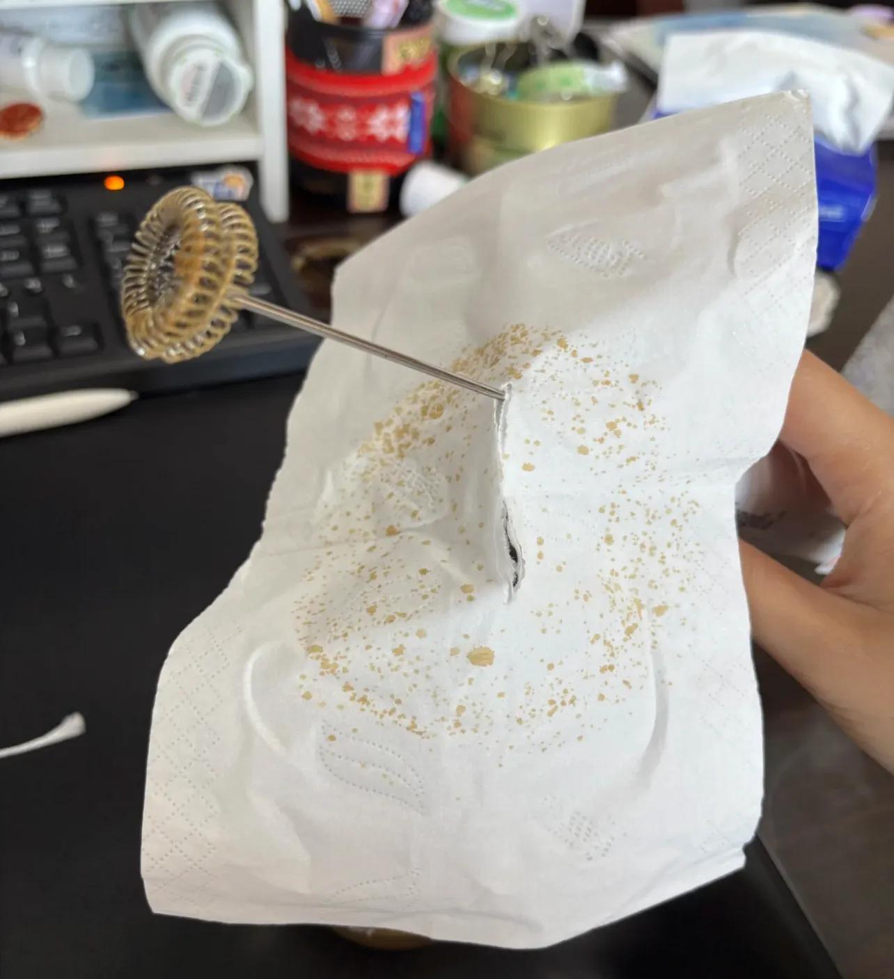 小tip:紙巾不要有沾溼,開紙巾的洞的時候一定要乾淨利落,不要有紙屑,不然會纏在攪拌棒上。